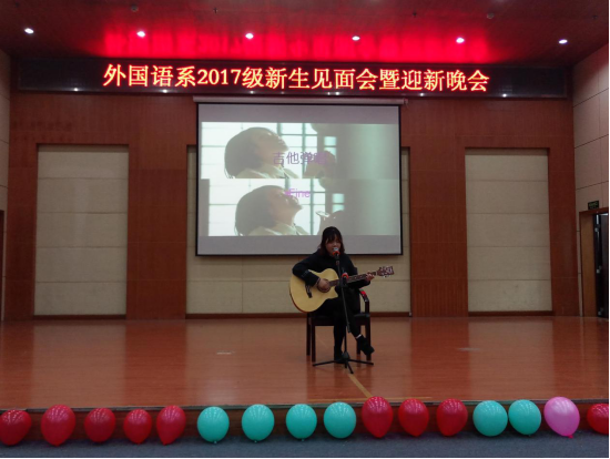 紧接着的节目是双语朗诵,新生们用流利的双语朗诵了诗歌《致橡树》,为我们带来了一场听觉盛宴,余音绕梁。2016级英语教育专业张秋怡为我们带来吉他弹唱《Fine》,曲调温柔悠扬,使我们沉浸在她的歌声里不能自拔。