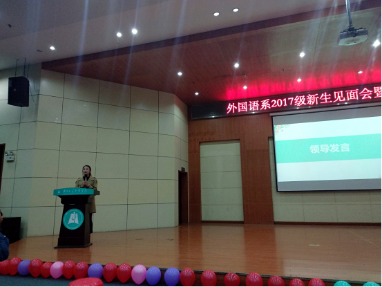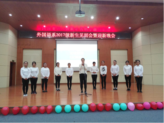 见面会开始,由我系学生会文艺部指导排练的爵士舞蹈串烧为大会热身。充满力量的舞步和激昂的音乐带动了场内气氛。舞蹈结束,此次新生见面会正式开始。外国语系傅丽书记为大会发言,向新生们表达了进入外国语系的祝贺,也希望同学们在外国语系好好学习、自主学习,共同进步。