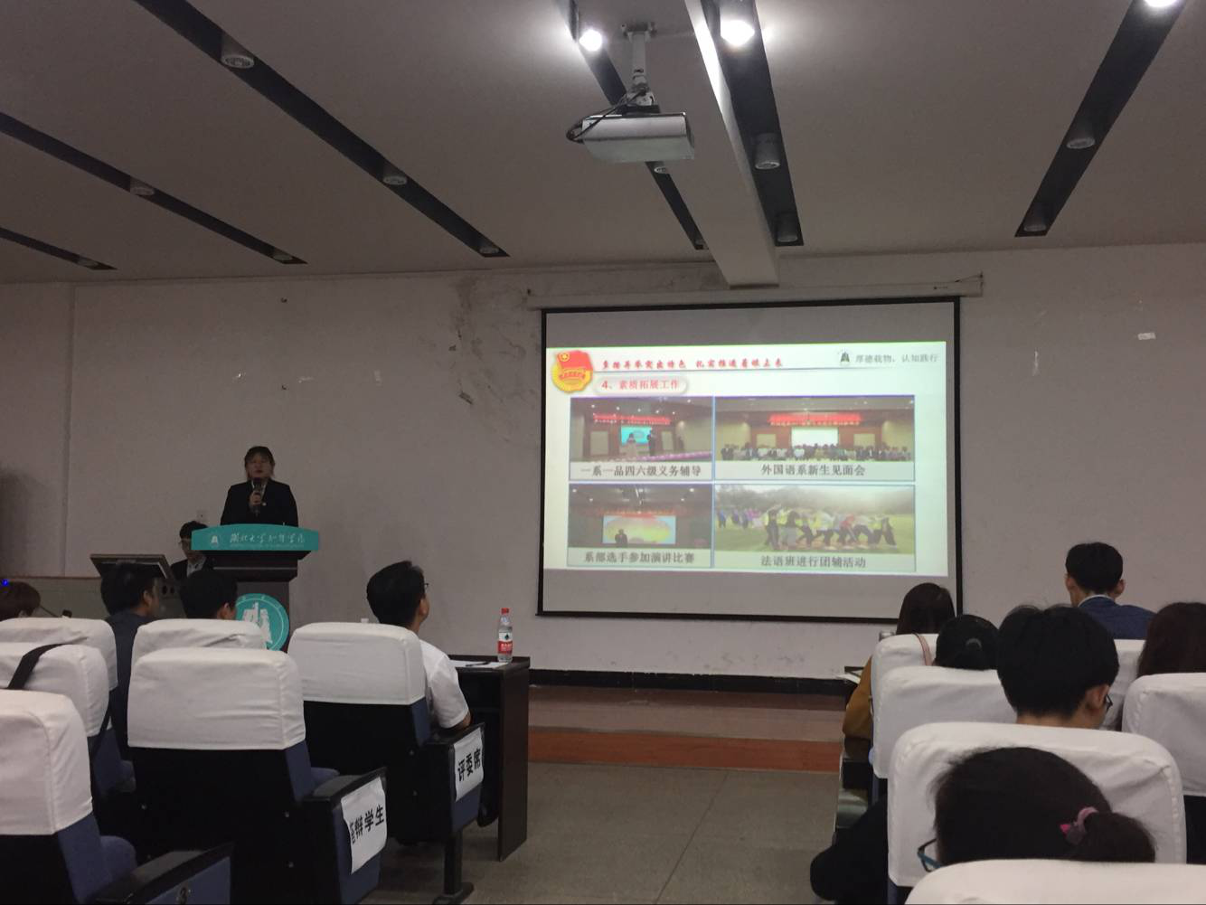 4月12日,院团委在报告厅302组织答辩会,我系分团委学生书记马妍通过视频、PPT、图片等形式,分别从团学组织建设、思想引领工作、 服务就业创业、大学生素质拓展、维护稳定、系部特色品牌等六个方面对我系2017年度的分团委工作进行了总结汇报,阐明了我系2017年以组织建设为根本,思想建设为龙头,创新活动为途径,新媒体平台为突破口的工作格局。在答辩环节中,马妍以清晰的思路,流利的回答出色的对评委的提问进行应答。精彩的脱稿演讲、内容丰富的PPT展示、具有创意的微电影,均获得领导和评委的一致好评。