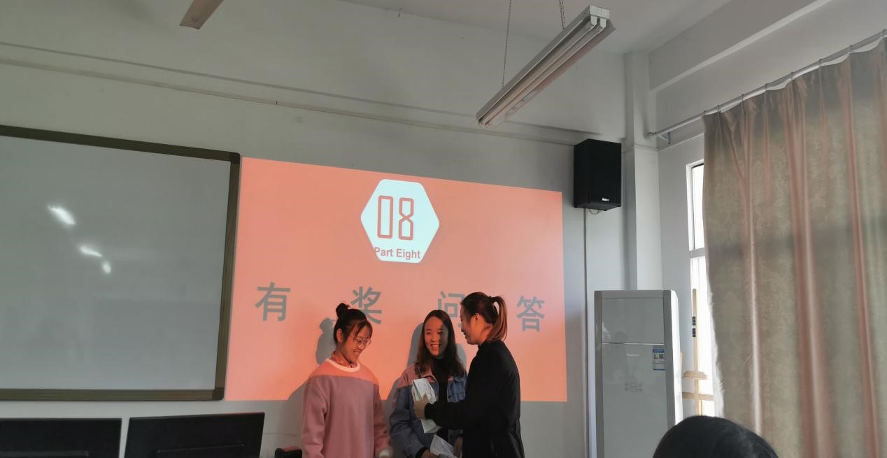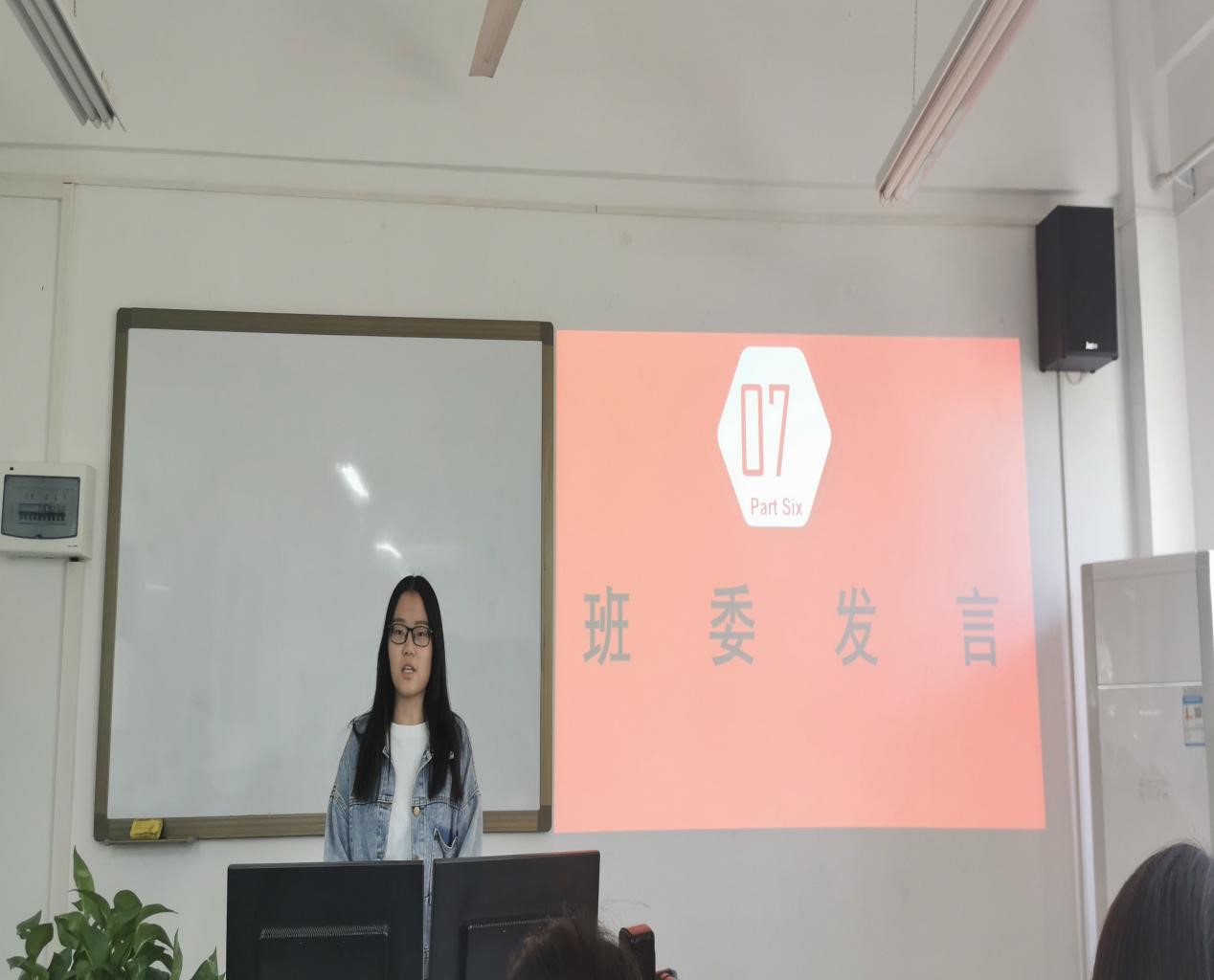 本次班会主题为“我与祖国共奋进”。班会在团支书张漫以一段热情洋溢的欢迎词中拉开序幕。辅导员李子昂老师首先介绍了我国近年来以北斗卫星导航系统为代表的一系列重大科技成果,并播放了视频短片“辉煌中国”。同学们都深受鼓舞,班委代表赵美先、聂君卓、谢爽分别结合在班级担任职务发言,描绘自己个人规划和班级工作构想。随后,班会进入有奖竞答环节,以轻松活泼的方式,帮助同学们更好地了解祖国70年来的辉煌历程。陈校助为获奖学生颁奖,并上台发言。她告诉同学们要为生活在这个伟大的时代感到庆幸,感谢党的伟大领导带领我们走向富强,期望同学们努力学习,完成中华民族伟大复兴的时代使命。最后,班会在《我和我的祖国》合唱中,圆满结束。