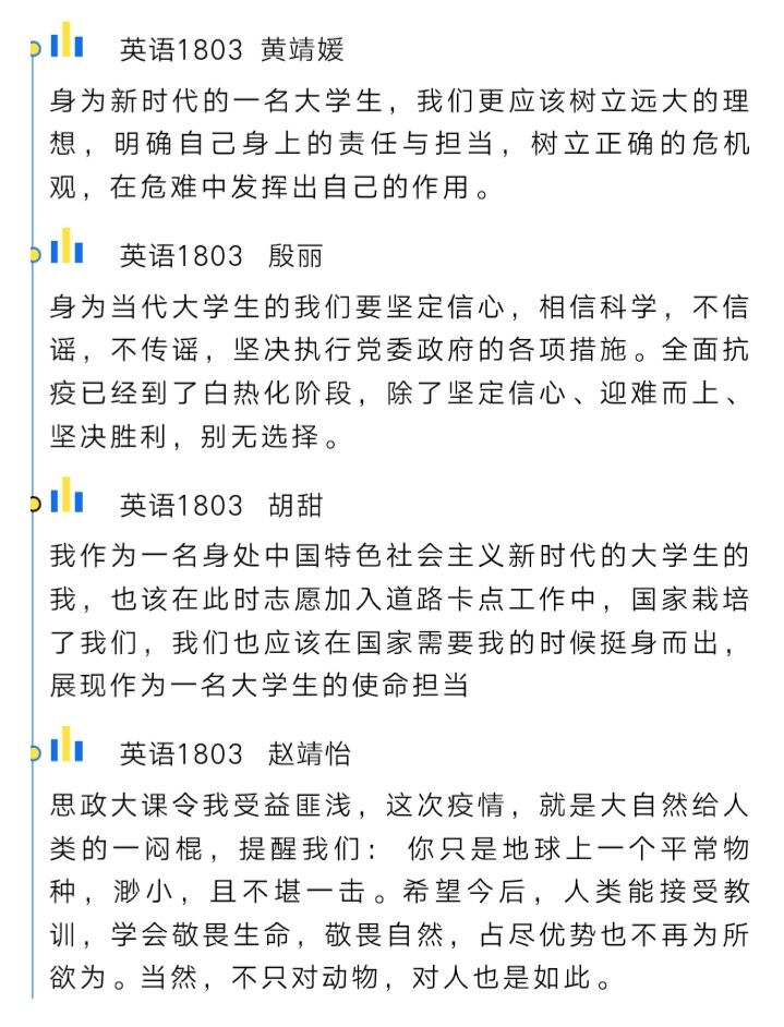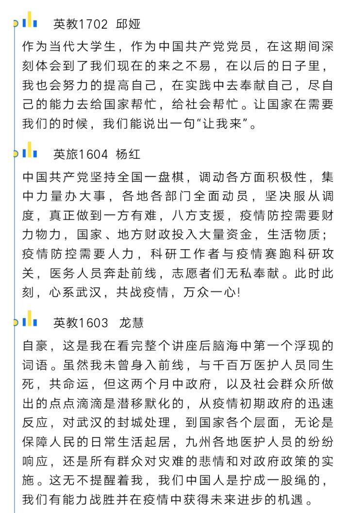 为将高校思想政治理论课教学优势转化为支持防疫斗争的强大力量,引导广大学生增强“四个意识”、坚定“四个自信”、做到“两个维护”,3月9日下午14:30至16:00,我院组织全体学生收看“全国大学生同上一堂疫情防控思政大课”。 本次“思政大课”特别邀请艾四林、秦宣、王炳林、冯秀军四位教授,解读党中央关于疫情防控的决策部署,分析中国抗疫彰显的中国共产党领导和中国特色社会主义制度的显著优势,讲述防疫抗疫一线的感人故事。全院1100余名学生收看“全国大学生同上一堂疫情防控思政大课”,深入了解党中央关于疫情防控的决策部署,广泛认识抗疫一线的战疫情、稳发展、群策群力、守望相助的故事,进而引导全院学生在战“疫”大考中上好人生大课,增强学校思想政治工作的实效性。 外院学子线上展开热烈的讨论、交流与思考,充分认识了中国抗“疫”彰显的中国共产党领导和中国特色社会主义制度的显著优势。