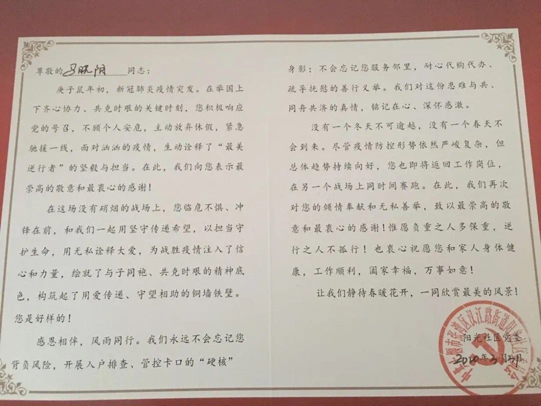 在疫情期间主动联系电商平台为居民配送日常生活物资以保障居民生活起居不受到影响,并积极配合十堰市卫健委,十堰市纪委以及疫情防控指挥部的入户调查和测量体温,积极参与社区组织的每日针对单元楼楼道,过道等公共场所的消杀和日间小区巡逻,提醒等后勤服务。