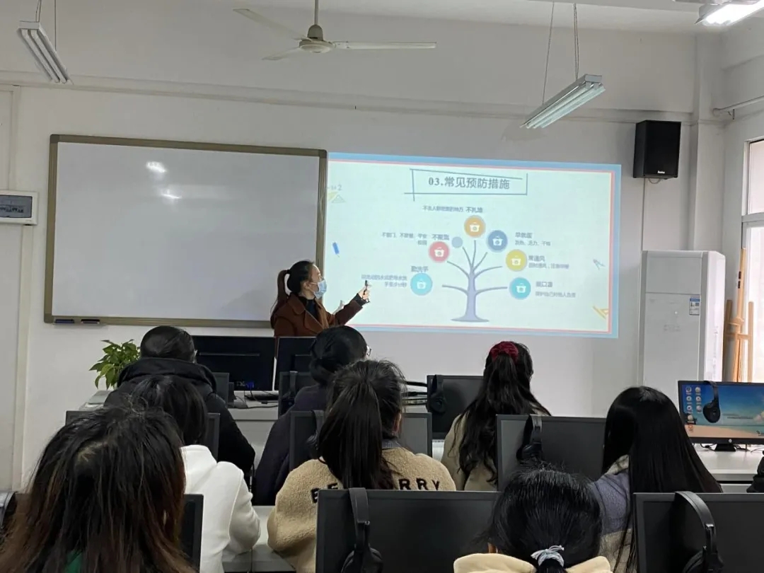 向蕊老师以“加强疫情防控,共建平安校园”为主题,对疫情防控形势、常态化疫情防控措施等作了详细解读,对春季常见传染病的症状、传染源、传播途径以及预防措施作了介绍,提醒同学们自觉养成良好的学习生活习惯,注意个人防护,共建健康校园。同时,向老师播放抵制网络谣言、防范网络诈骗视频,广泛宣传防骗知识和技巧;以本学期专四考试时间为切入点,提醒同学们珍惜时间、尽快进入备考状态。
