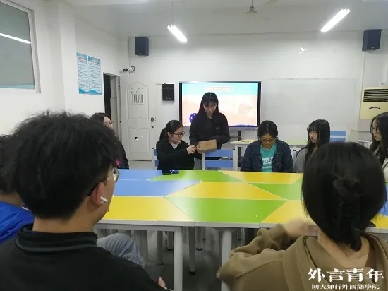 影片观看结束后,随即迎来的是大家期待已久的话语接龙。游戏规则是全部人围成一圈,从第一个人开始说"今天我吃了一个AA"(AA为随意食物名!接着第二个接着说,吃了一个AA,二个BB…(BB不同的食物名!)像这样一直传下去,每传一个人就必须重覆前面的食物名,另加一个新的食物名。一直到有人讲错出局!此项游戏考验大家的记忆能力和反应能力,尽管有些同学不太熟悉规则,但游戏还是顺利地通过了。