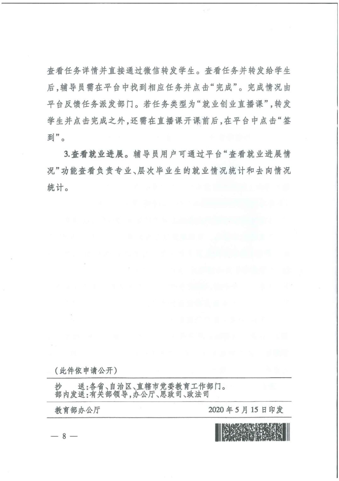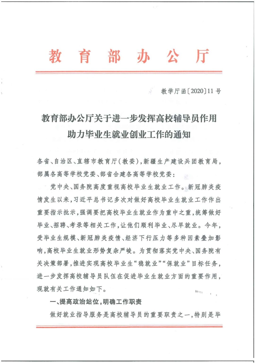 教育部办公厅关于进一步发挥高校辅导员作用助力毕业生就业创业的工作通知