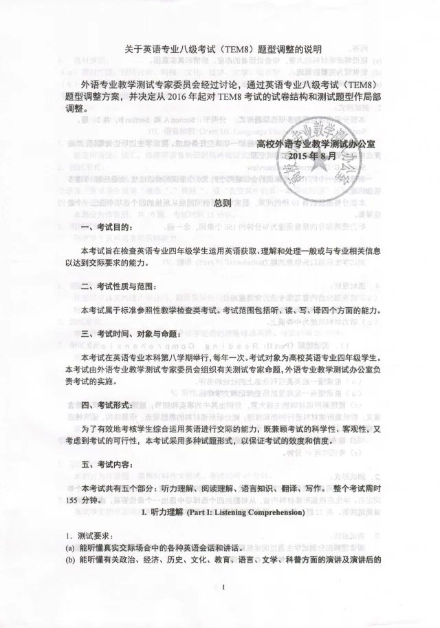 接高校外语专业教学测试办公室文件通知,英语专业四、八级考试于2016年开始进行试卷结构和测试题型局部调整,现就文件具体附录如下,请即将参考的同学做好相关准备。
