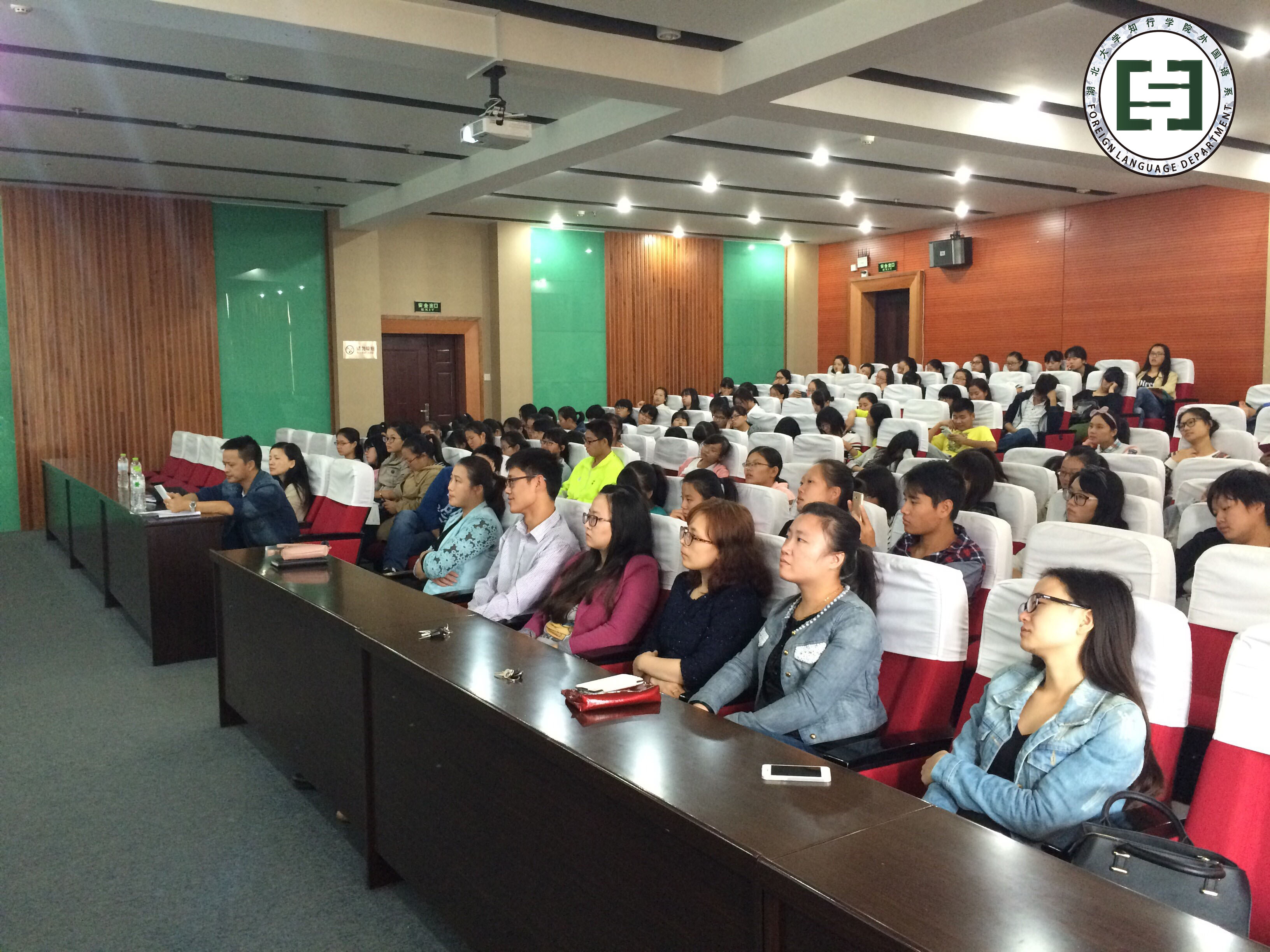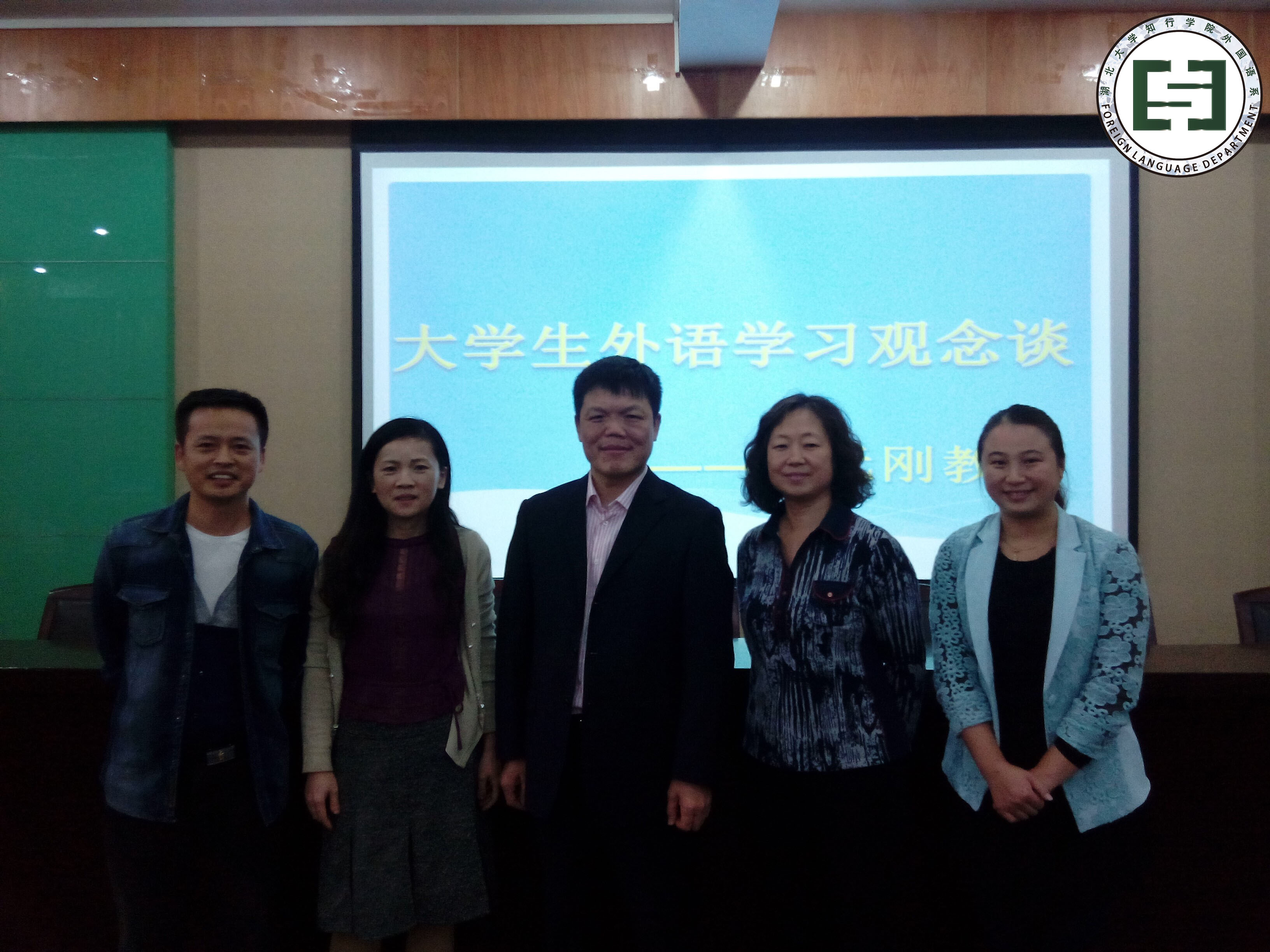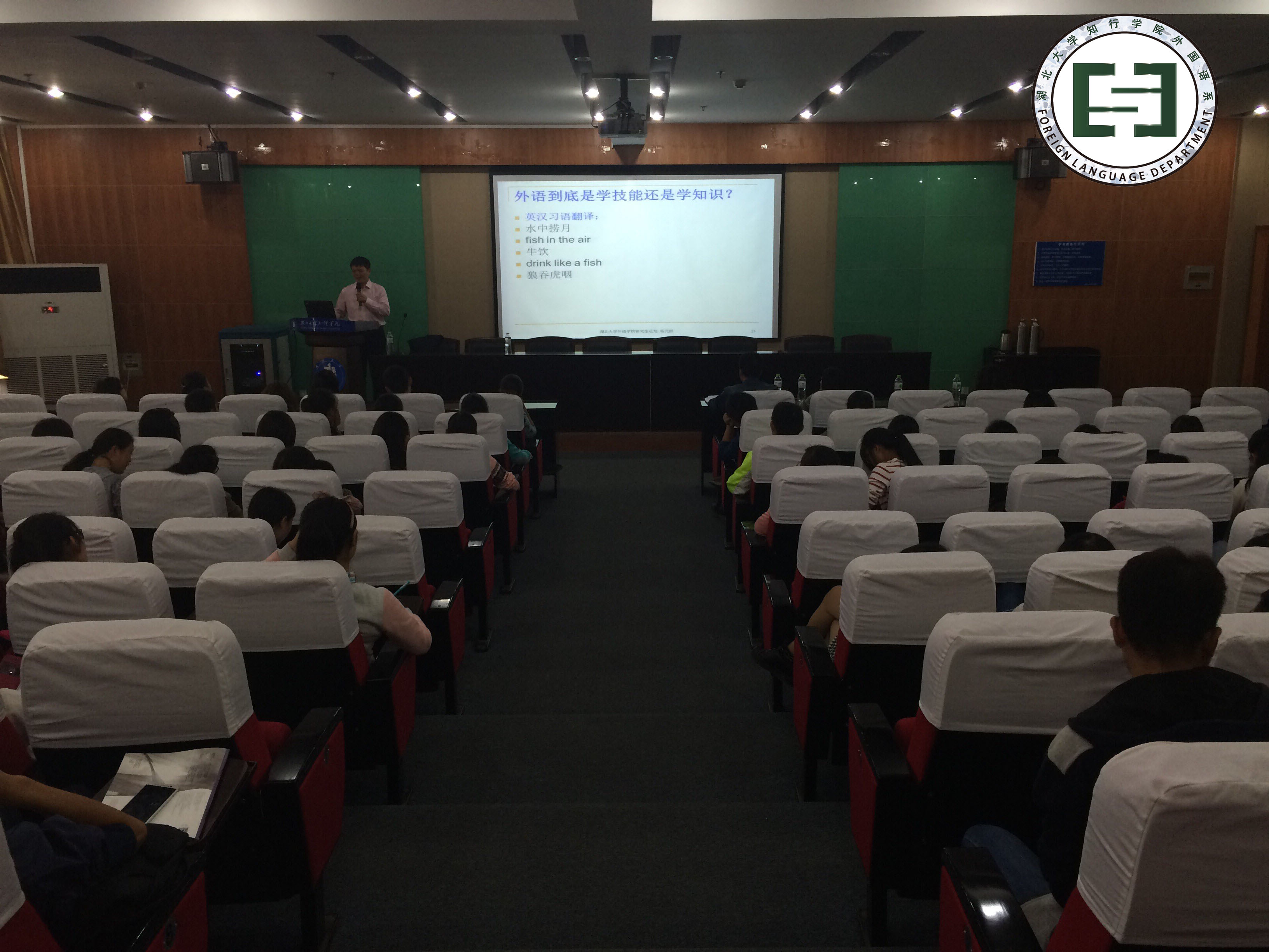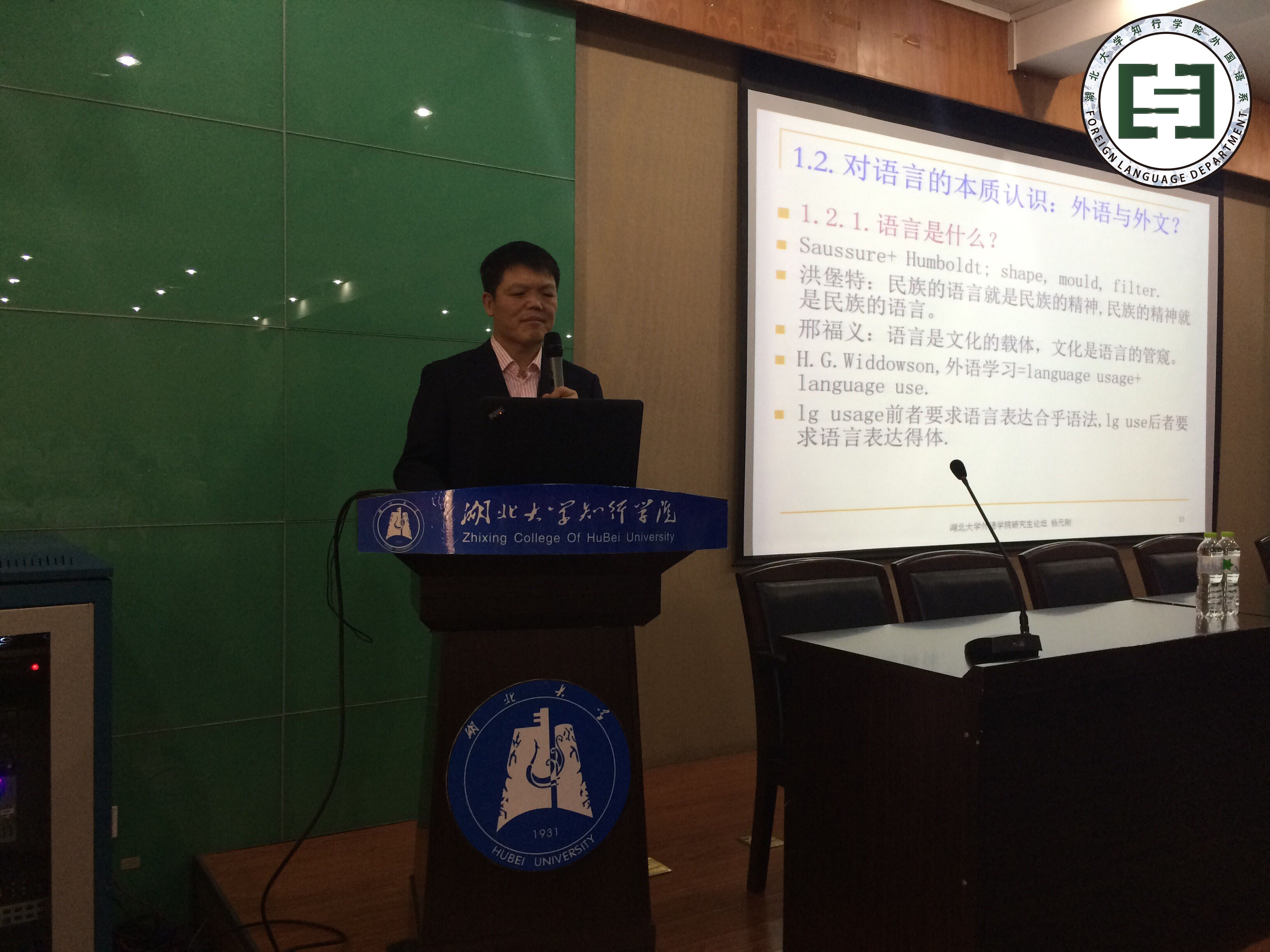 本网讯(通讯员 汤飘)10月22日下午,武汉市翻译协会常务副会长、湖北大学yl7703永利集团副院长杨元刚教授应邀莅临我院,在行政楼学术报告厅202做了主题为“大学生外语学习观念谈”的讲座。yl7703永利集团副院长钟春敏,外国语系主任冯健、书记刘克、副书记傅丽及全体辅导员出席了本次讲座。