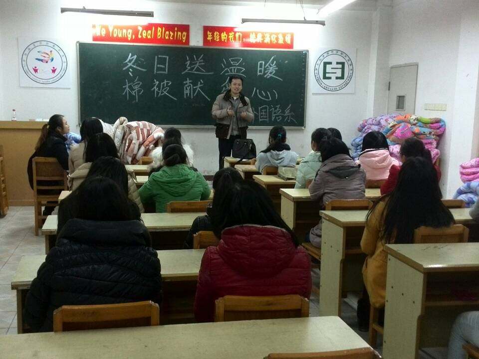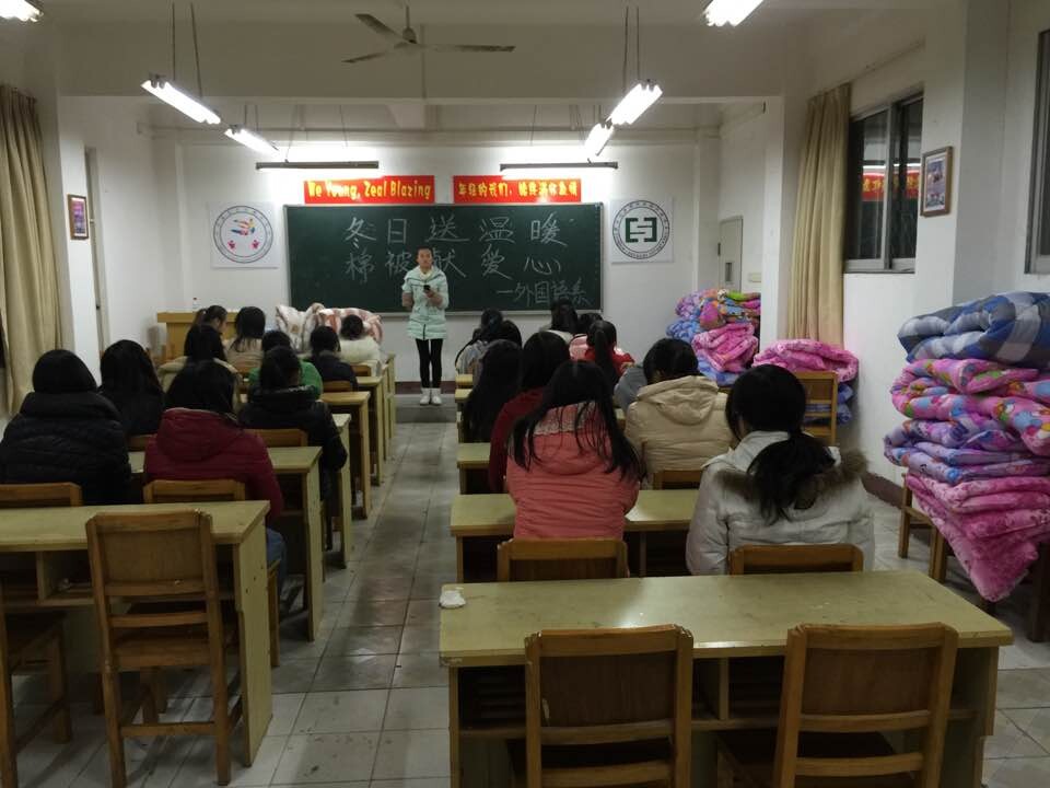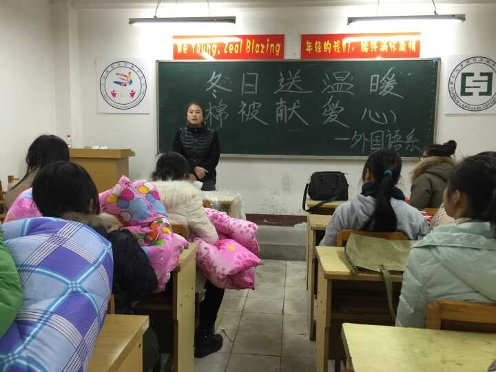 本网讯(通讯员唐超)12月16日晚6点30,外国语系“冬日送温暖,棉被献爱心”活动在1教206室正式举行。书记刘克,副书记傅丽,辅导员冯书祥、饶丽娜出席了活动。