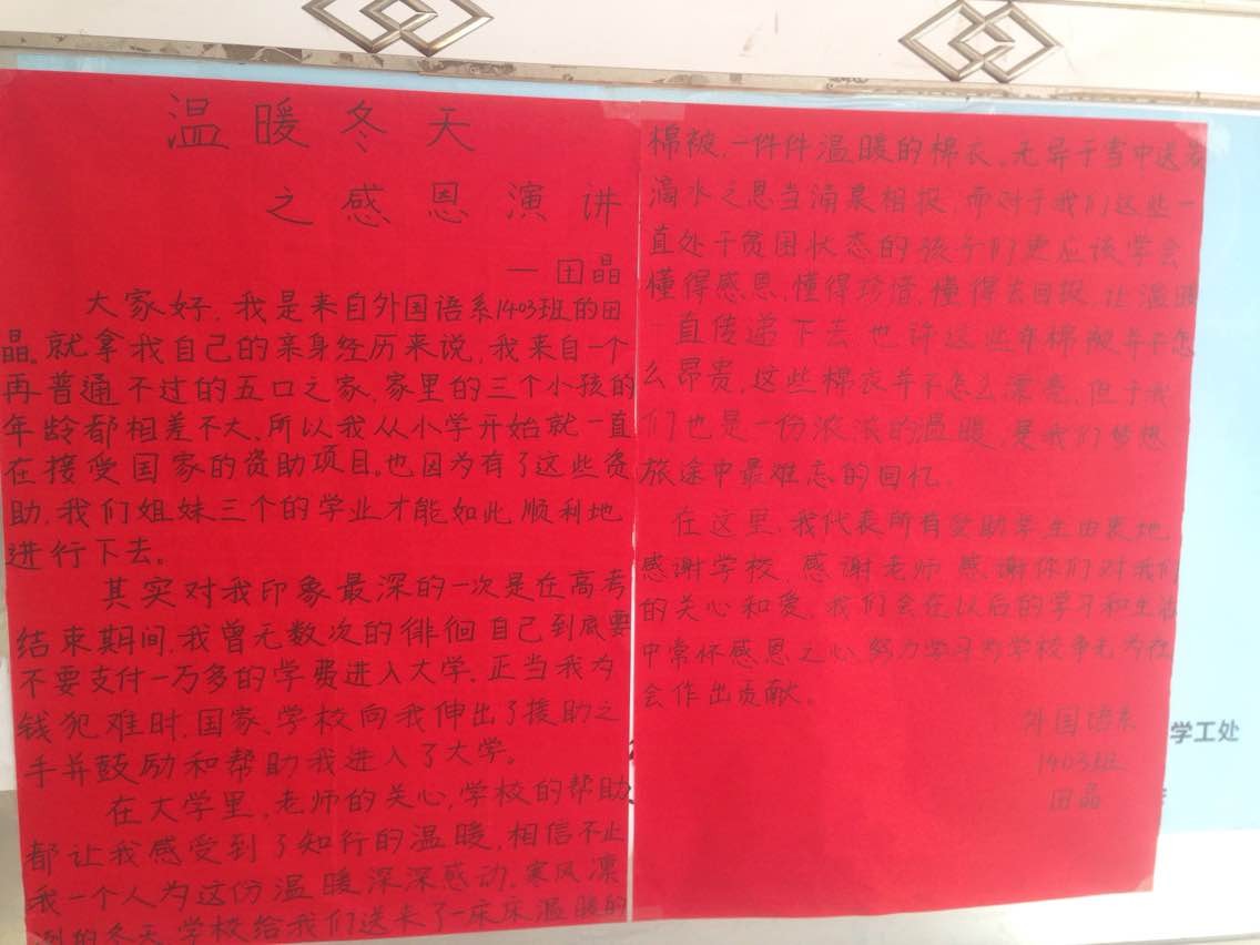 活动由外国语系副书记傅丽主持,受助学生代表田晶以自身经历深情表达了对于国家和学校关怀资助家庭经济困难学生的感恩之情,坚定了努力学习,坚强自立的决心和信心。刘克书记则鼓励同学们不要因为经济的困难而失去原则和信念,要向李嘉诚、马云等榜样学习,通过知识和奋斗改变自己和家庭的命运。接着,刘克书记和傅丽书记亲自将棉衣棉被一一送到受助学生手中。
