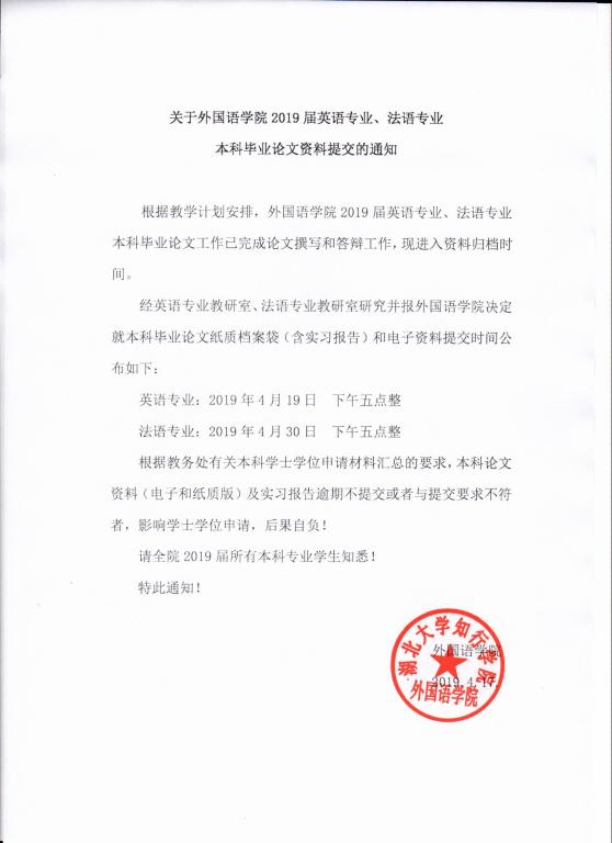 关于yl7703永利集团2019届英语专业、法语专业本科毕业论文资料提交的通知