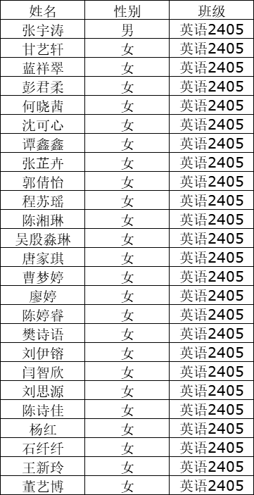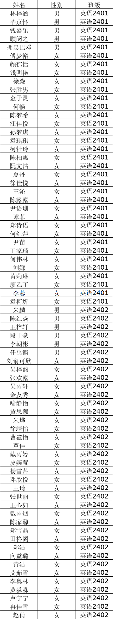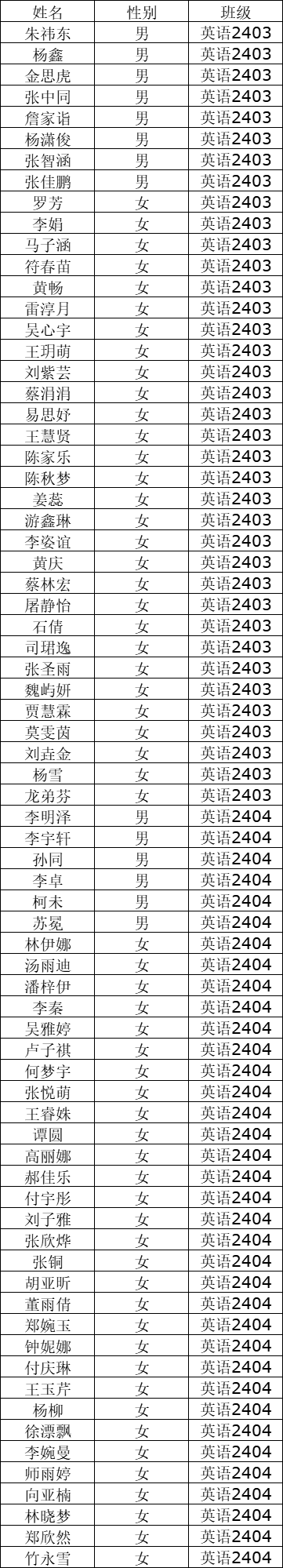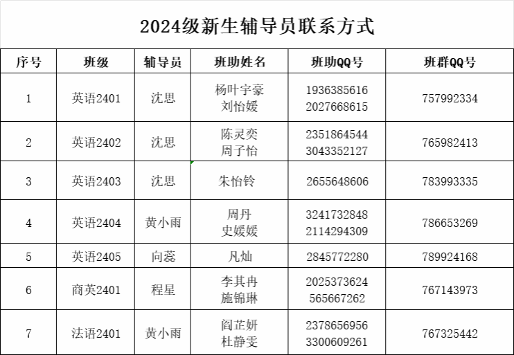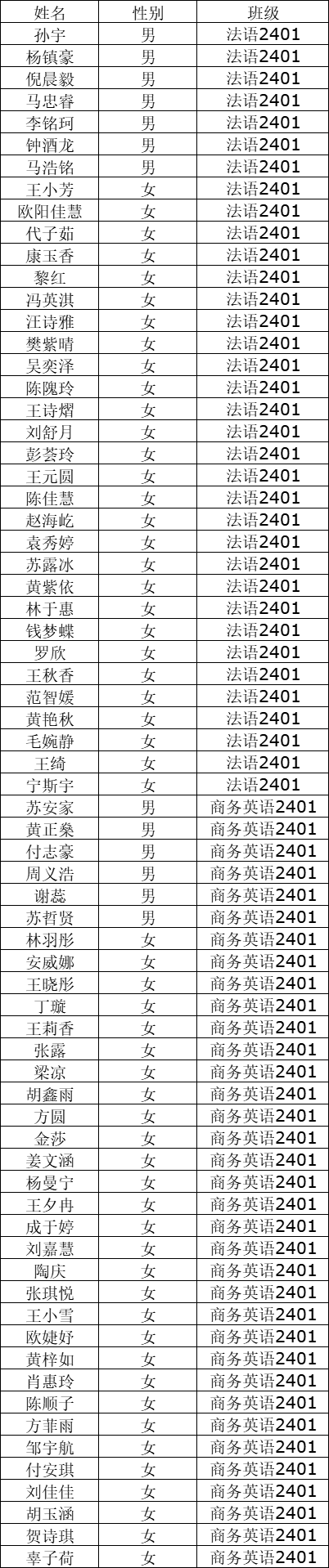 全体2024级新生:学院现根据学校招就处录取专业及英语专业分方向(含实验班)意愿征求,现公布2024级yl7703永利集团各专业分班名单,yl7703永利集团2024级共分为7个专业班级:法语2401本 、商务英语2401本 、英语2401本(含翻译和教育方向)、 英语2402本(教育方向)、英语2403本(教育方向)、英语2404本 (教育方向)、英语2405本(综合实验班)。