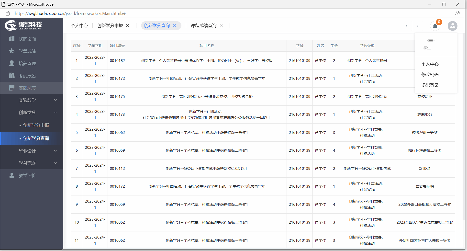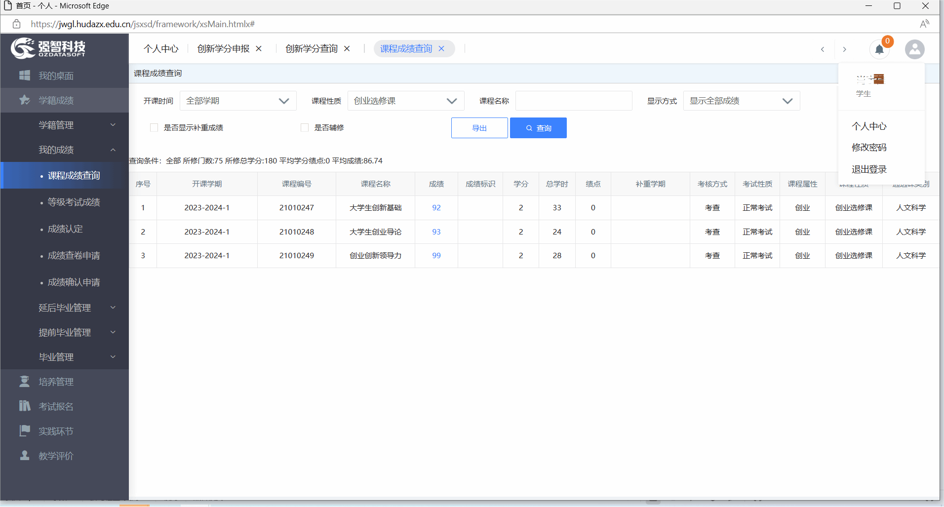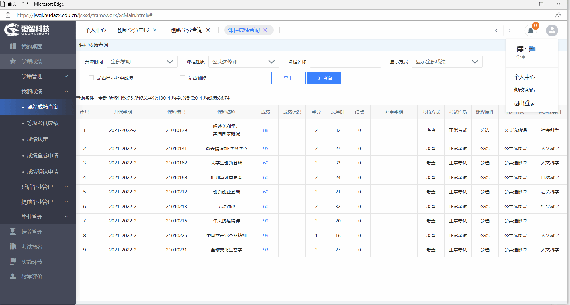 创新学分、创业学分、公选课学分、学位课程成绩、补考记录均可在强智教务系统查询,以下为查询方法: