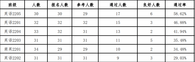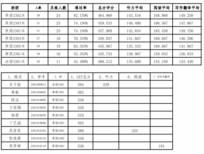 (1)大学英语四级相关数据:英语四级各班合格数据,各教学班班级英语四级成绩第一名,单项最高名单。