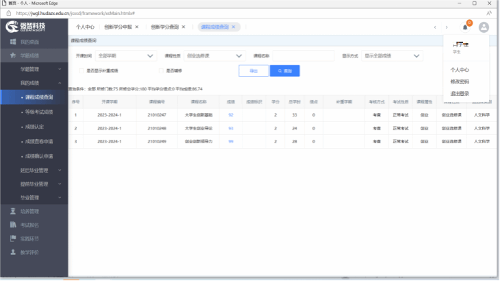 2、创业学分: 截图如下 ,右上角:必须有姓名