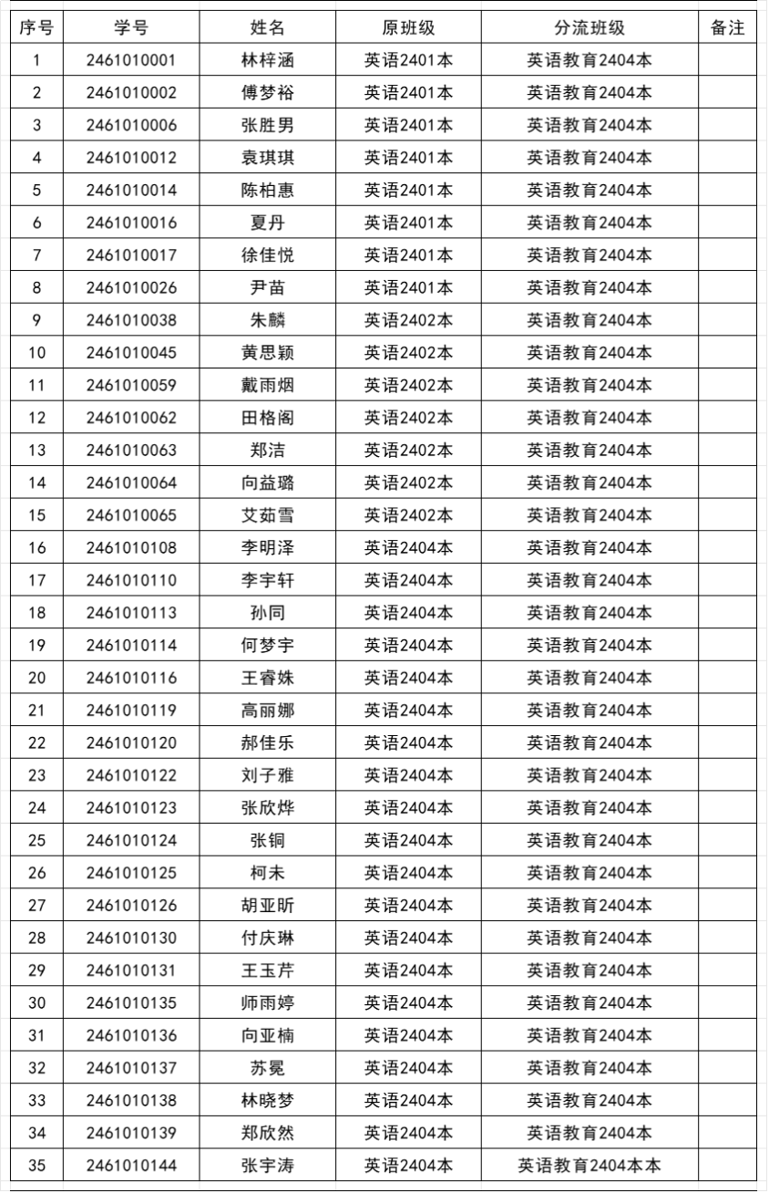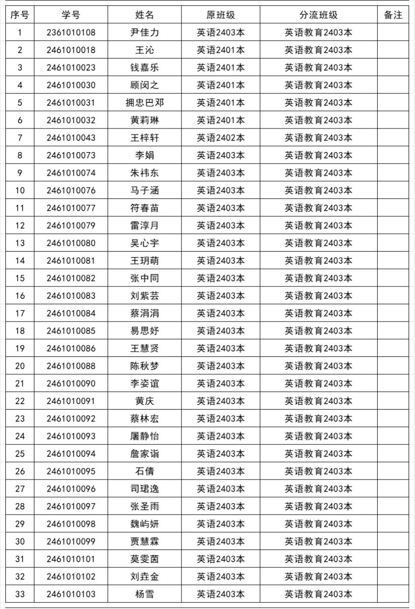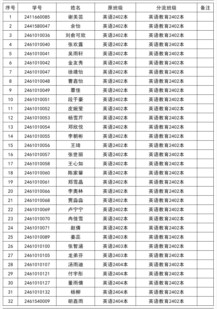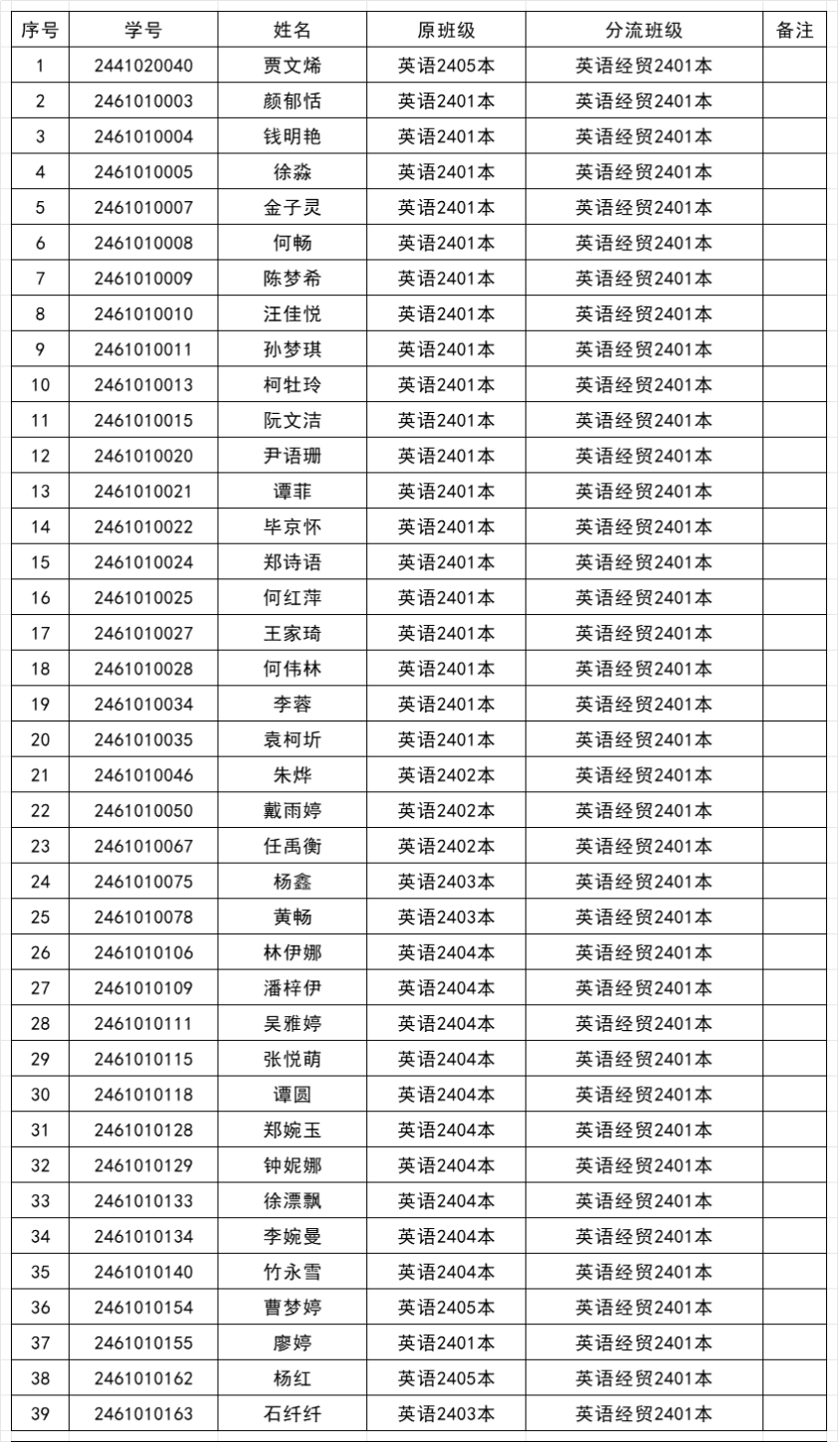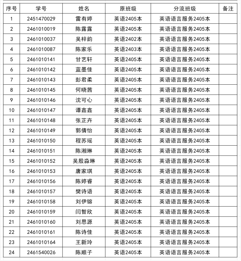 经统计汇总、志愿匹配与统筹安排,2024级英语专业最终分流后的行政班级建制如下: