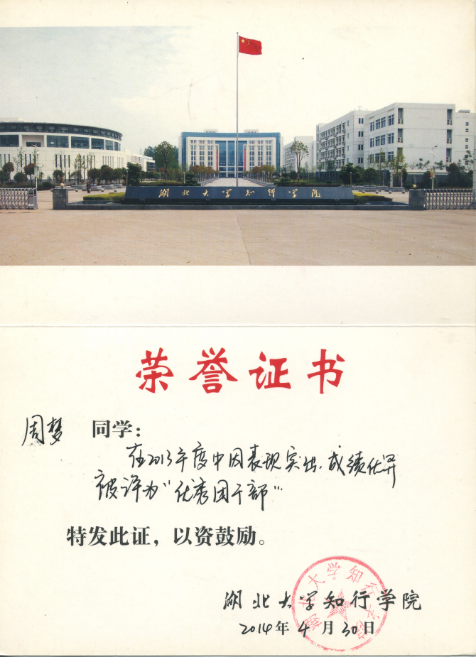 此外,身为班级的团支书,她认真组织班级每月的团日活动,积极的引导同学们向党组织靠拢,多次被学院评为优秀团员干部。在学院组织的旧书收购、英语四六级义务辅导、运动会、阳光体育运动等活动中都能看到她忙碌的身影。她积极参与社会实践活动及志愿者服务来提高自己的社会阅历和见识。她相信,这些对她自己有很大的帮助及提高。