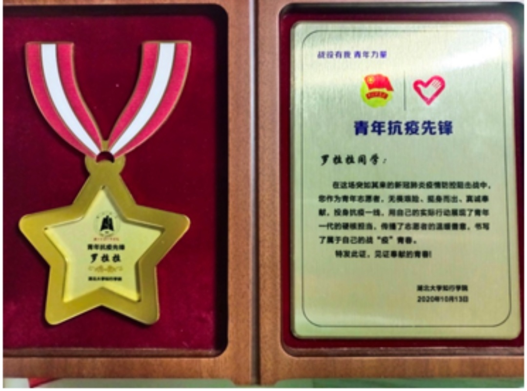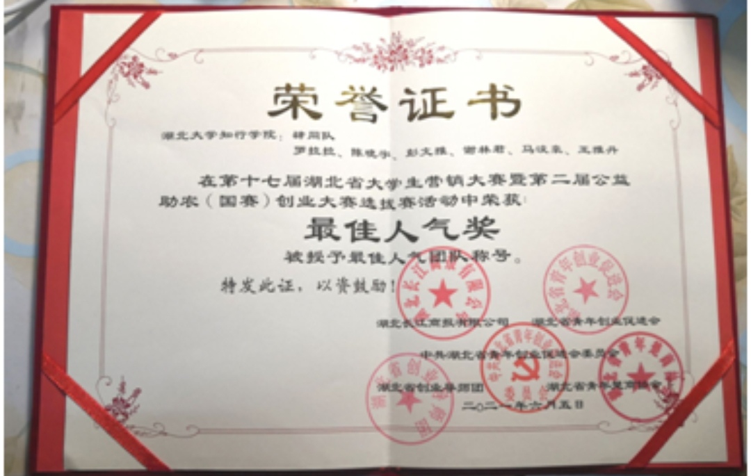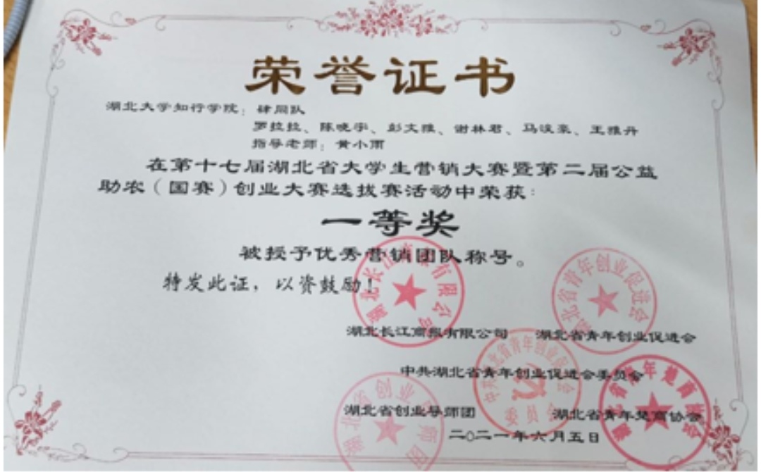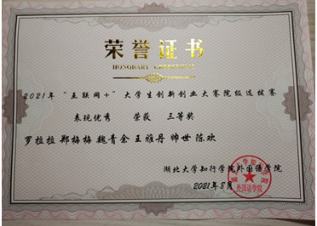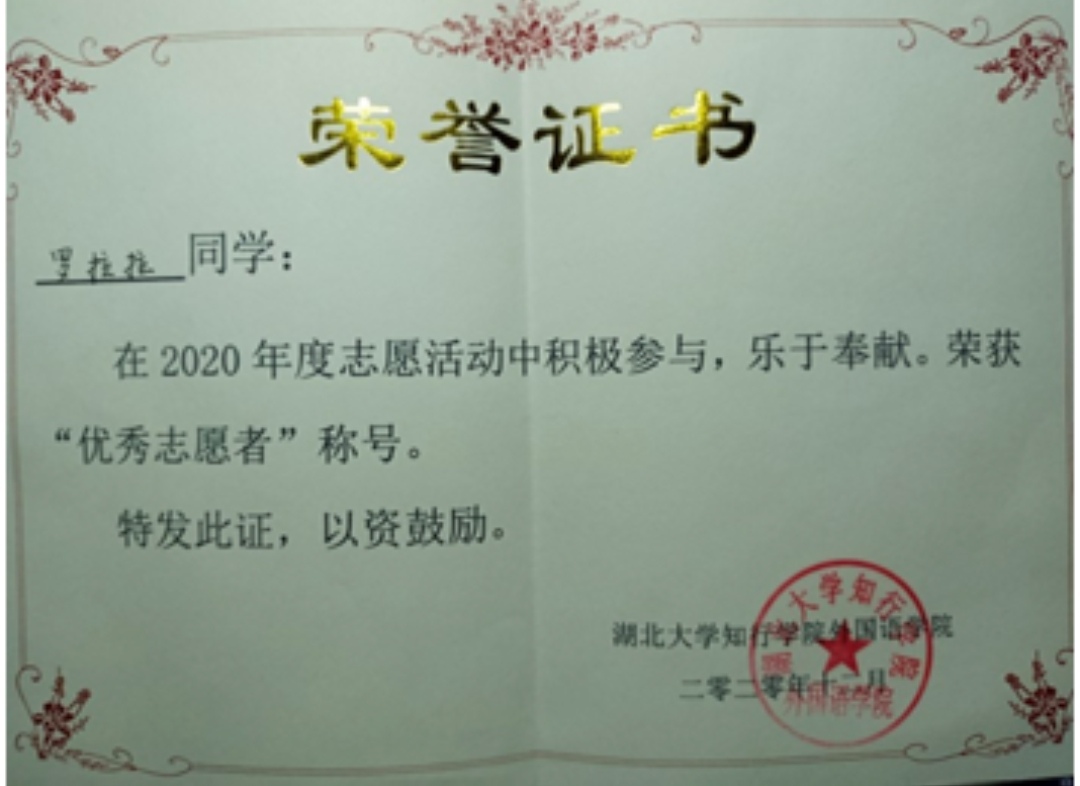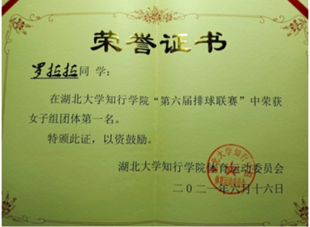 曾获得荣誉:2021年校级排球女子组团体第一名、2020年青年抗疫先锋称号;外院优秀个人;优秀学员;优秀志愿者称号;优秀干事;2021年湖北省大学生营销大赛暨公益助农创业大赛获一等奖、最佳人气奖;2021年“互联网+”大学生创新创业大赛院级选拔赛三等奖
