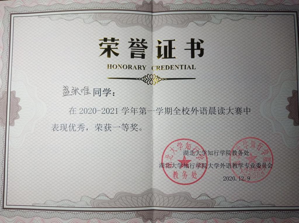 很荣幸能获得此次的励志奖学金。于我而言,在得知评上这次奖学金后,我感到很惊喜,但同时也很欣慰,而更多的是感激。它是对我过去一年努力的肯定,也是激励我未来不断完善自己的动力。感谢国家对教育的大力投资,很庆幸出生于中国这样一个有爱的环境里,国家助学政策的卓识远见为我们提供了许多学习的机会;感谢所有老师与辅导员的辛勤付出,教授我们专业知识和技能以及做人的道理:感谢英语2002班这个优秀上进的班集体,营造出了良好的学习生活氛围。