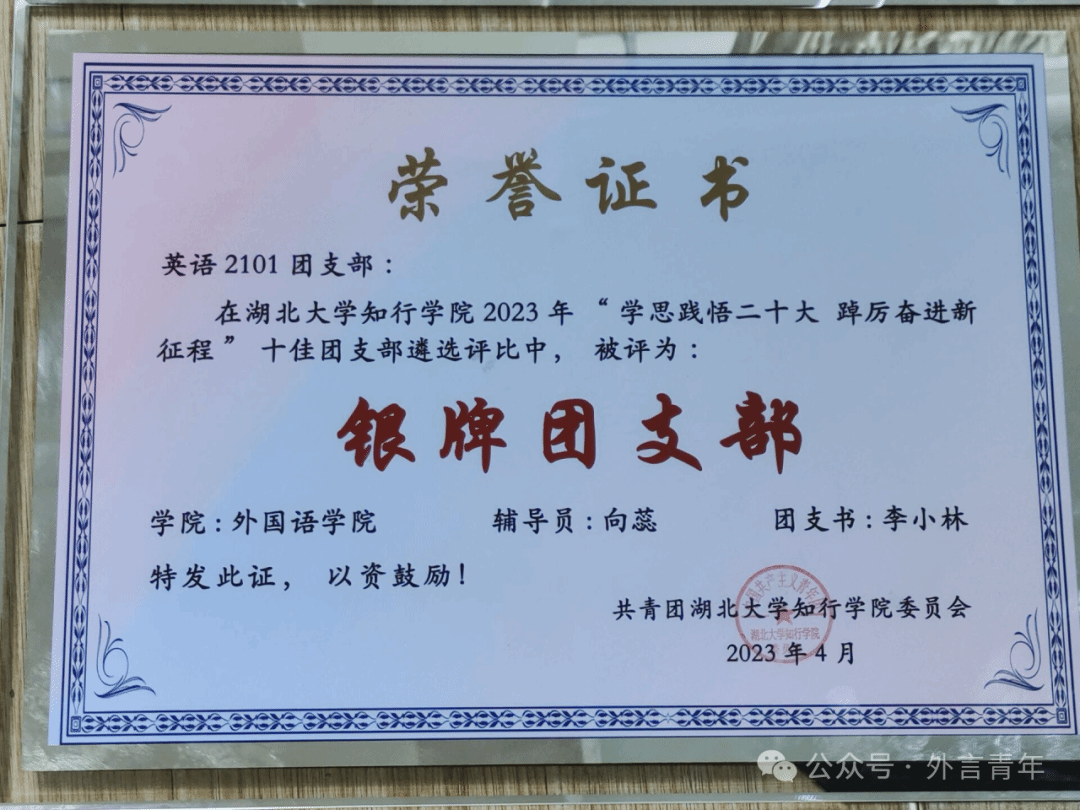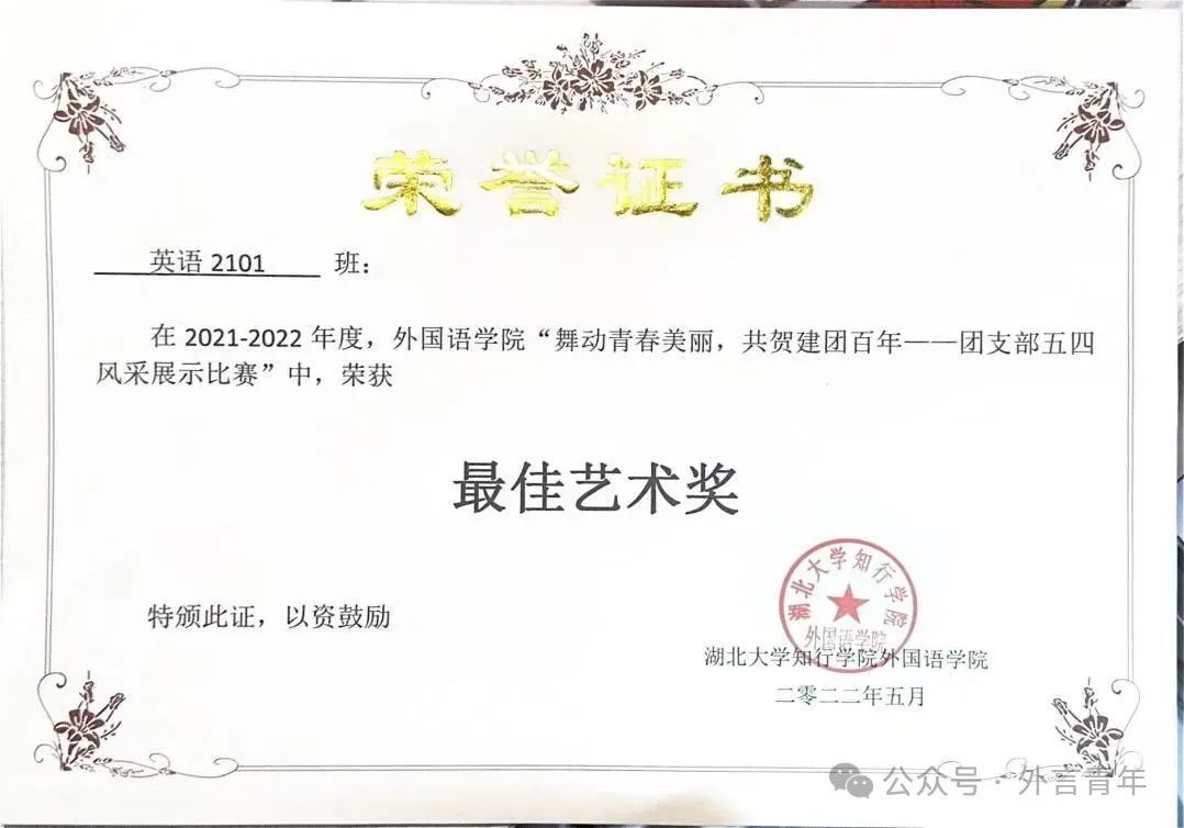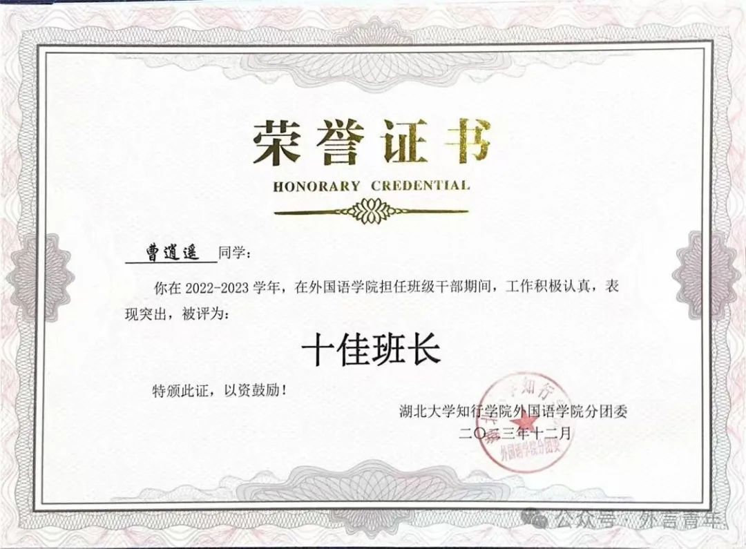 个人荣誉:学年综合成绩班级第一,获校级奖学金、国家励志奖学金,在校期间曾获“优秀学生干部”“优秀志愿者”等荣誉。获2024年全国大学生英语竞赛三等奖、湖北省翻译大赛初赛二等奖、“21世纪杯”演讲比赛二等奖、优秀共青团员、十佳班长、优秀干部、暑期三下乡“优秀个人”等;在担任班长期间,带领班级同学获“银牌团支部”“星级学风班级”等荣誉称号。