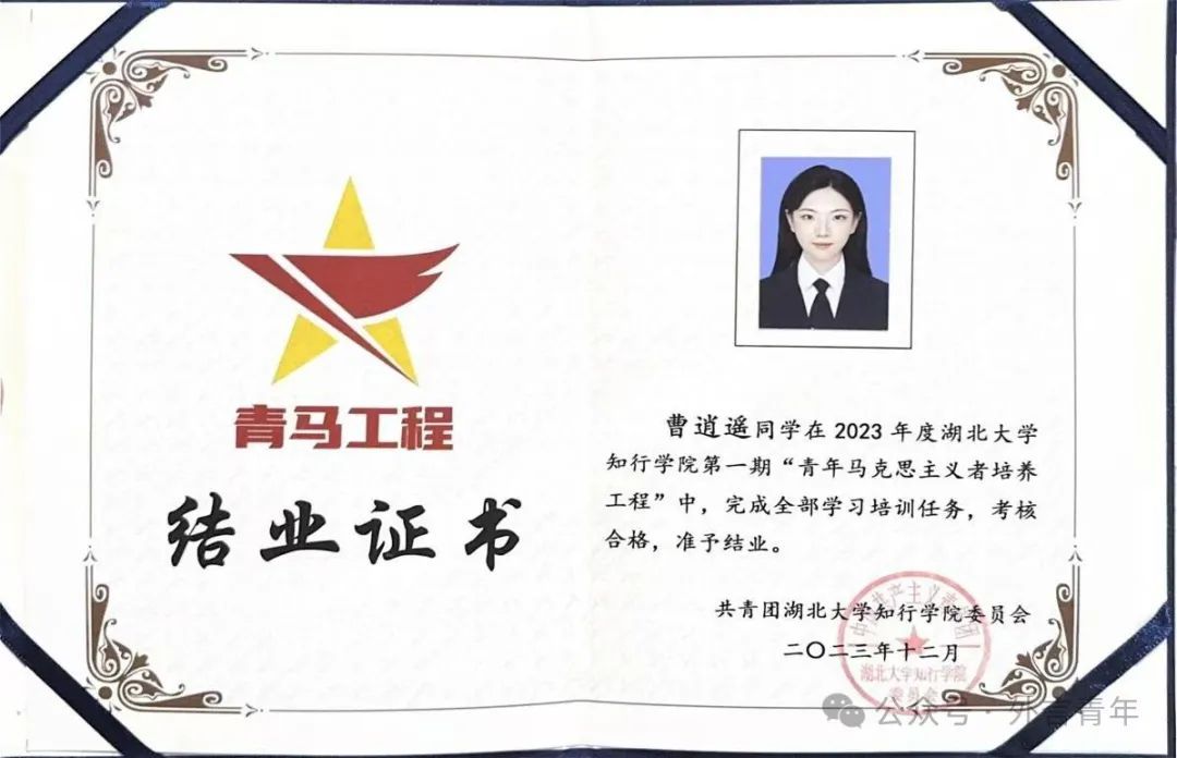 优秀事迹:大学伊始,曹逍遥同学便向党组织递交了入党申请书,并在接下来的学习和实践中深入贯彻习近平新时代中国特色社会主义思想,投身疫情防控志愿岗、迎新志愿者、社区支教等实践中,累计参加志愿服务数十余次。在大三学年她参加yl7703永利集团第一期“青马工程”培训班,参与理论学习、红色教育、研讨交流,与团队开展校外大学生实践课堂,不断将所学内化、深化、转化。