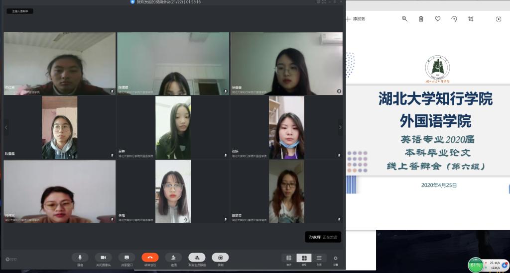 本次线上答辩主要使用“钉钉”平台的视频会议功能,为确保线上论文答辩顺利进行,学院本科毕业论文工作小组在前期进行了积极筹划和精心准备。英语专业共分为10个答辩小组,每组设有答辩组长和答辩秘书,各个小组在正式答辩前分别进行了网络设备调试和预演。
