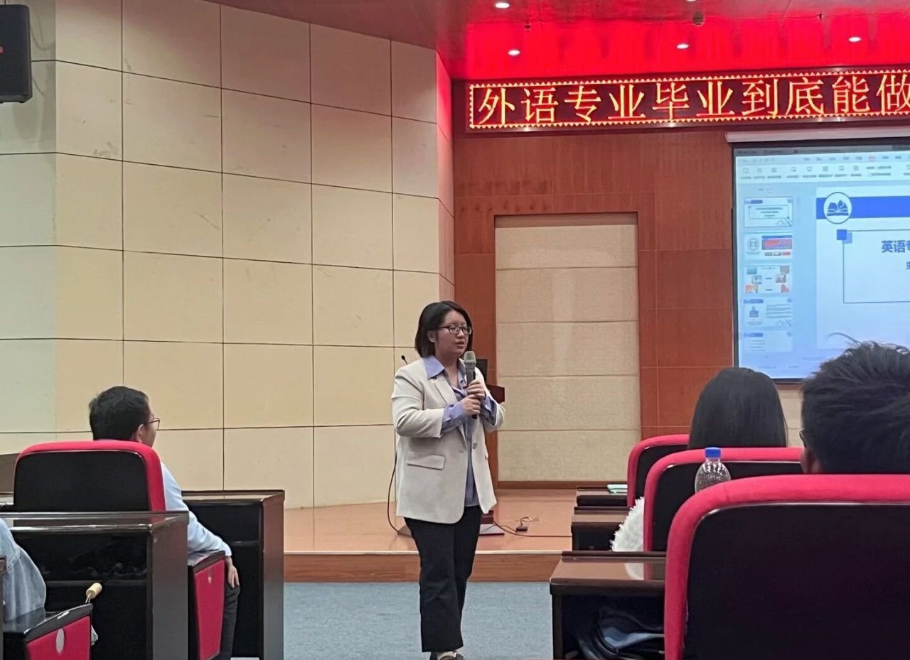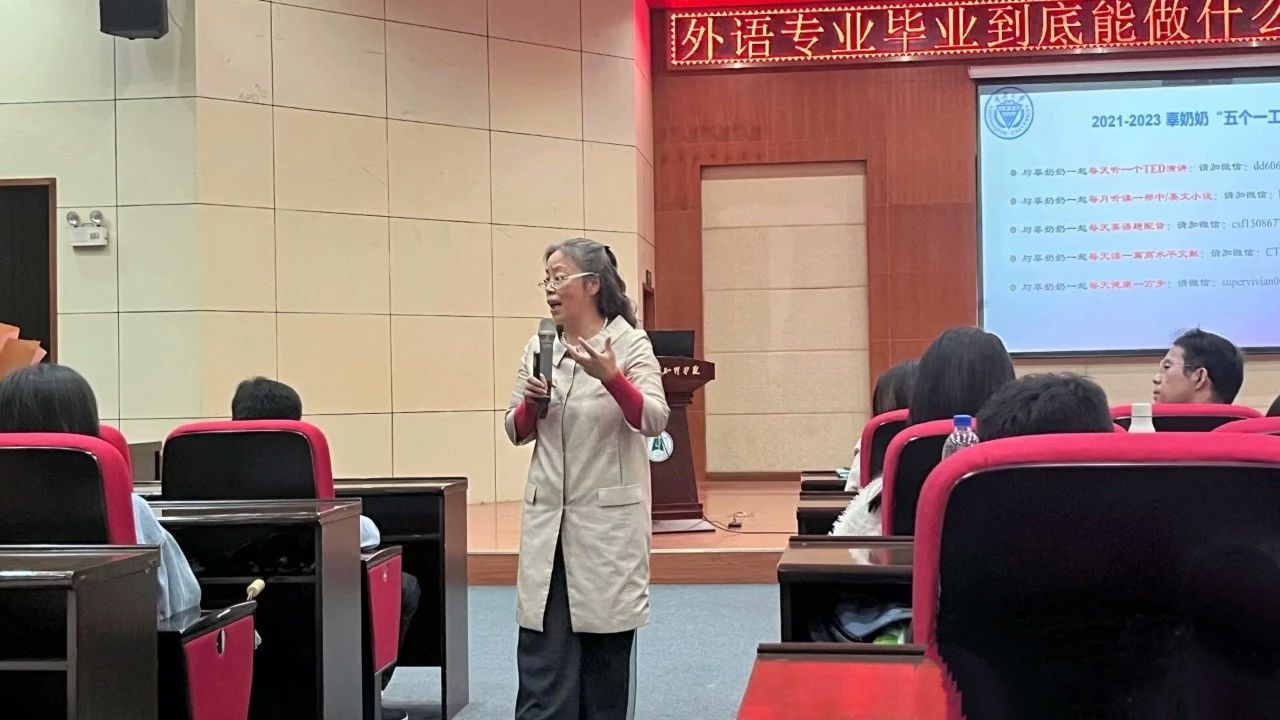 讲座伊始,辜教授结合自身教育经历,深入浅出地向同学们传递“起点不决定终点”的观点,鼓励外语专业学生们树立长远发展的志向。接着,辜教授结合教育实践和育人经历,以自己指导的本科生、研究生、博士生学业就业发展为例,回答很多师生、家长和社会共同关注的语言专业毕业生的去向问题,探讨了外语类专业学生如何在大学中利用时间提升自己的专业能力和核心竞争力;她同时指出英语是各行各业的敲门砖,一定会为同学们未来的人生提供更广的纬度和更多的选择,“外语+专业”的多元就业方向一定可以让当下和未来不再迷茫。之后,辜教授围绕英语专业人才培养国家标准和21世纪人才“人生胜任力”框架进行详细剖析,指出面对国家及世界的专业和人才标准,外语专业学生应该扎实掌握学科知识,掌握信息提炼能力,培养创造性思维,批判性思维,培养社会责任感。