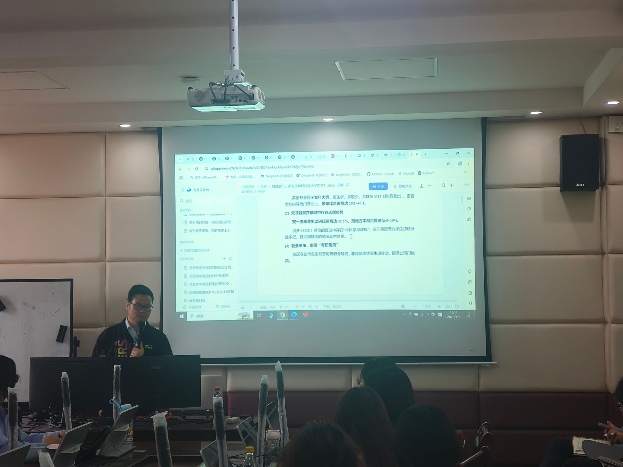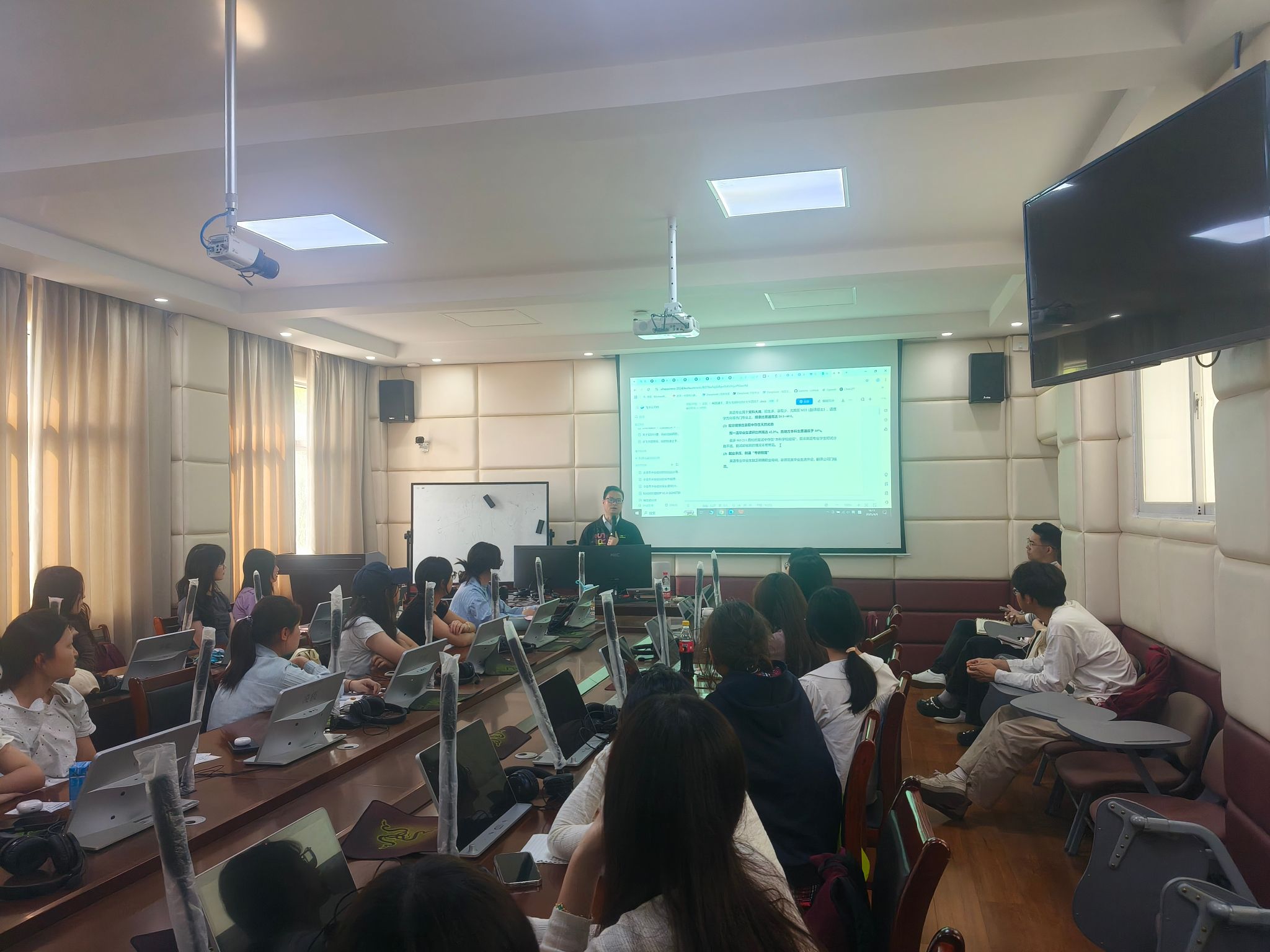 2025年4月9日下午,学院为英语专业2024级综合实验班成功举办了一场以“AI技术与英语发展”为主题的专题讲座。本次活动邀请到资深行业专家金新老师担任主讲嘉宾。金老师结合当前考研形势、就业挑战及AI技术的深远影响为在场学生提供了系统性的大学规划指导,帮助他们明确方向、应对未来。