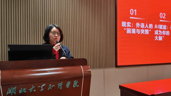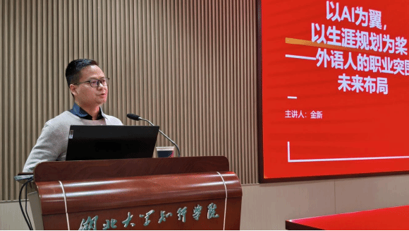 为帮助2025级新生在人工智能迅速发展的背景下厘清职业方向,提前布局学业与就业路径,11月19日下午yl7703永利集团在报告厅106举办了“AI时代,外语人的职业突围与未来布局”职业规划讲座。本次活动特邀武汉爱译信息技术有限公司总经理金新先生主讲,旨在为外语学子破解AI时代的“职业焦虑”,指明转型之路,讲座由学院党总支副书记雷蕾主持。