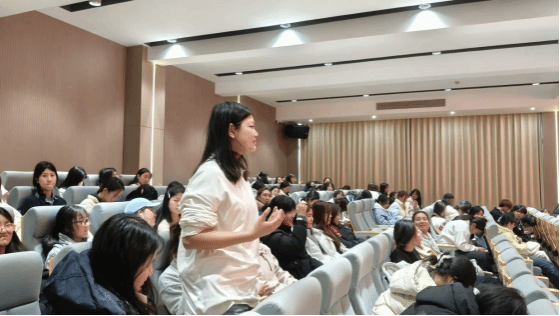 在随后的互动环节,教研室主任王丹老师鼓励同学们打破思维定式,结合自身困惑大胆发问。新生们踊跃举手,就“AI时代的语言学习重点变迁”“复合型人才的具体技能树构建”等焦点问题频频发问。金新老师耐心倾听,并结合行业前沿动态与实操案例逐一给出了细致而务实的解答,为新生们的职业规划提供了极具参考价值的“路书”。