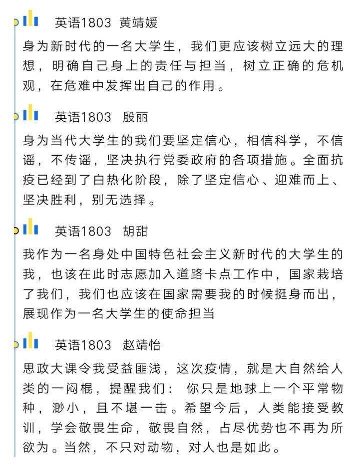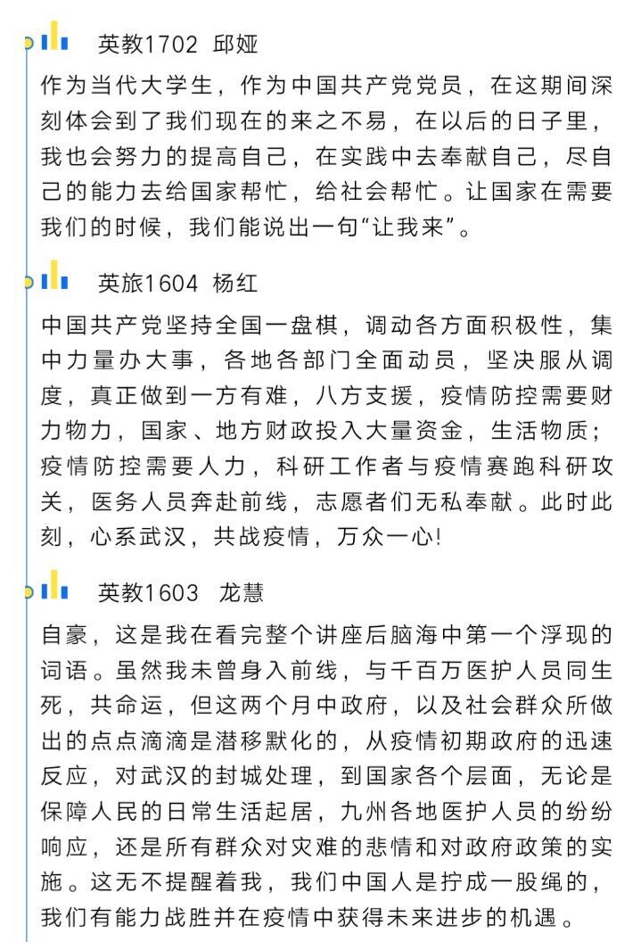 为将高校思想政治理论课教学优势转化为支持防疫斗争的强大力量,引导广大学生增强“四个意识”、坚定“四个自信”、做到“两个维护”,3月9日下午14:30至16:00,我院组织全体学生收看“全国大学生同上一堂疫情防控思政大课”。本次“思政大课”特别邀请艾四林、秦宣、王炳林、冯秀军四位教授,解读党中央关于疫情防控的决策部署,分析中国抗疫彰显的中国共产党领导和中国特色社会主义制度的显著优势,讲述防疫抗疫一线的感人故事。全院1100余名学生收看“全国大学生同上一堂疫情防控思政大课”,深入了解党中央关于疫情防控的决策部署,广泛认识抗疫一线的战疫情、稳发展、群策群力、守望相助的故事,进而引导全院学生在战“疫”大考中上好人生大课,增强学校思想政治工作的实效性。外院学子线上展开热烈的讨论、交流与思考,充分认识了中国抗“疫”彰显的中国共产党领导和中国特色社会主义制度的显著优势。(供稿人:向蕊、李艳)