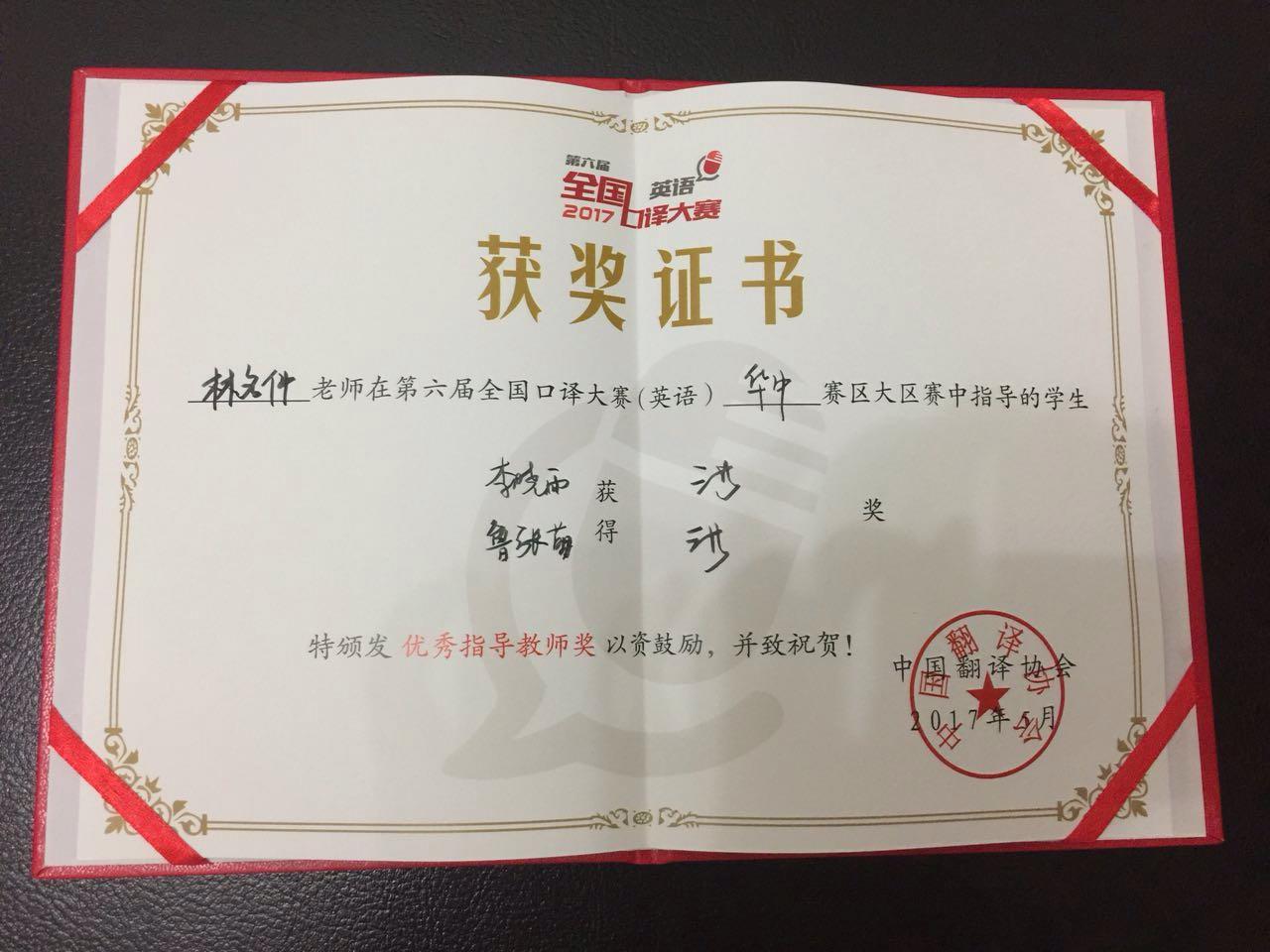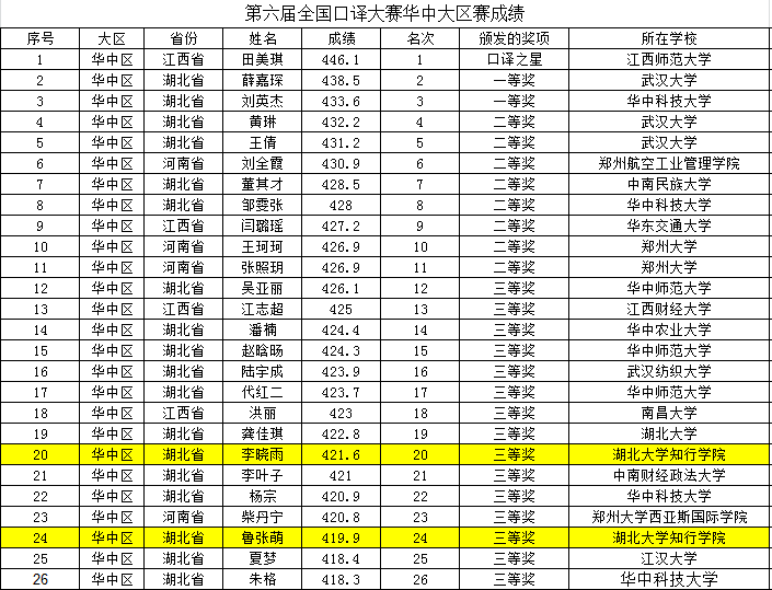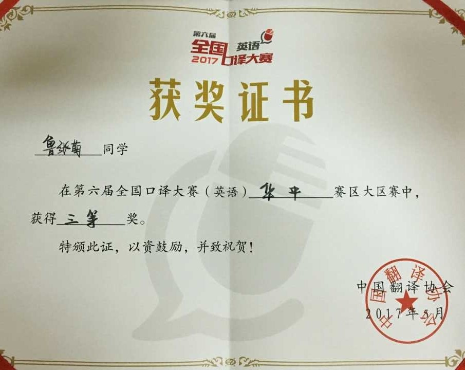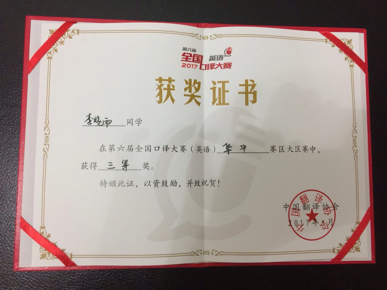 4月15号上午,第六届全国口译大赛湖北赛区复赛在武汉大学开幕。来自武汉大学、华中科技大学、湖北大学等院校的130余名优秀选手展开激烈争夺。在经过淘汰赛和晋级赛比拼后,我院英语专业翻译方向1404班李晓雨、鲁张萌两位同学荣获省赛三等奖并顺利入围华中大区赛39人名单,1404班黄兴华、1304班张欢两位同学荣获优秀奖。