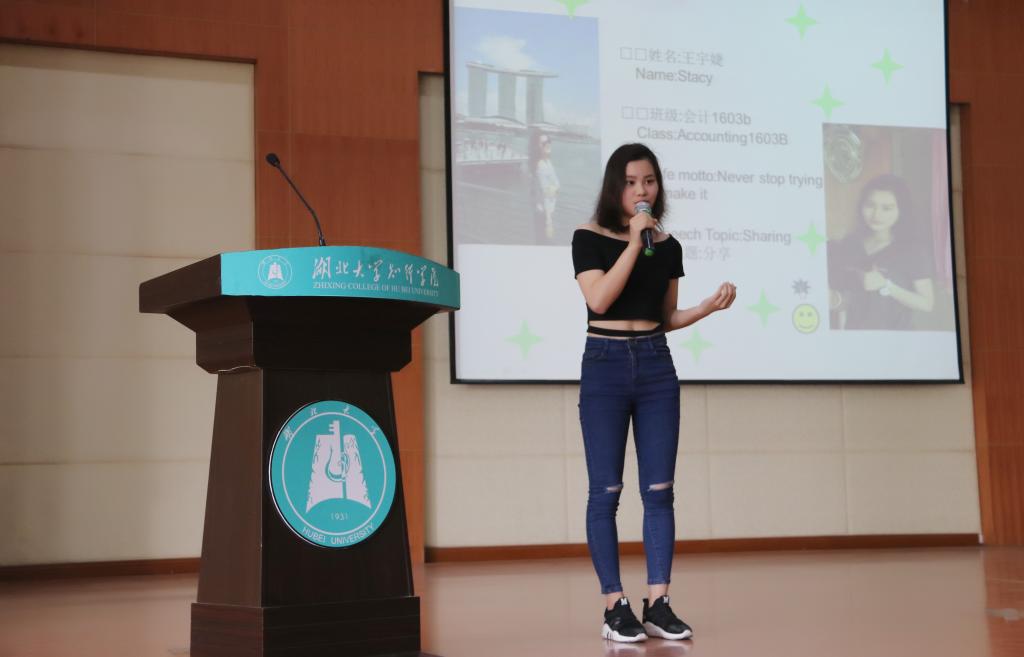 本次比赛演讲系列分为定题演讲、即兴演讲、现场问答三个环节。定题演讲中,来自经管、人文、生化、会计、外语系等十四名选手分别围绕文学与我、分享、中国与全球视野等众多话题展开思想的碰撞交流,即兴演讲中选手采取现场抽题作答,同学们的敏锐思维和个性化思想赢得了在场评委和同学的阵阵掌声和笑声。值得一提的是本次演讲类选手两个组别大多都是2016级学生,他(她)们稳健的台风、标准的语音和流畅的表达展示出了大一同学良好的英文语言素养。歌曲比赛中来自艺术系、人文系、计算机系等七组选手在完成英文自我介绍后也尽情释放激情,献上了“Take Me to Your Heart”和“Someone Like You”等经典英文歌曲。