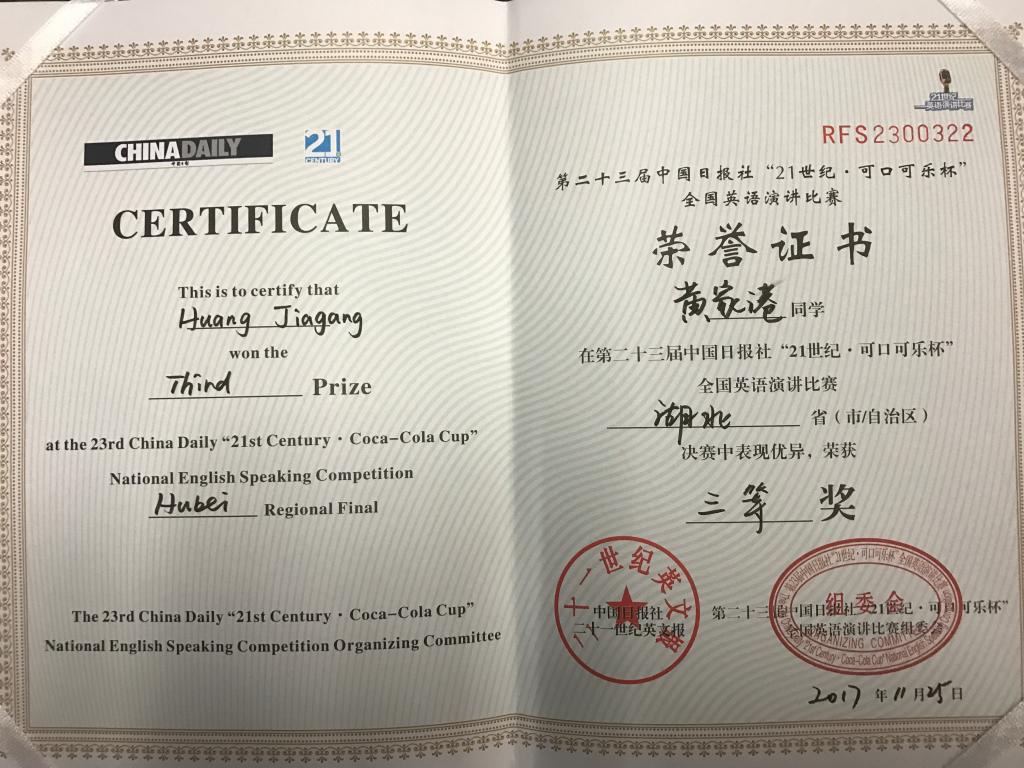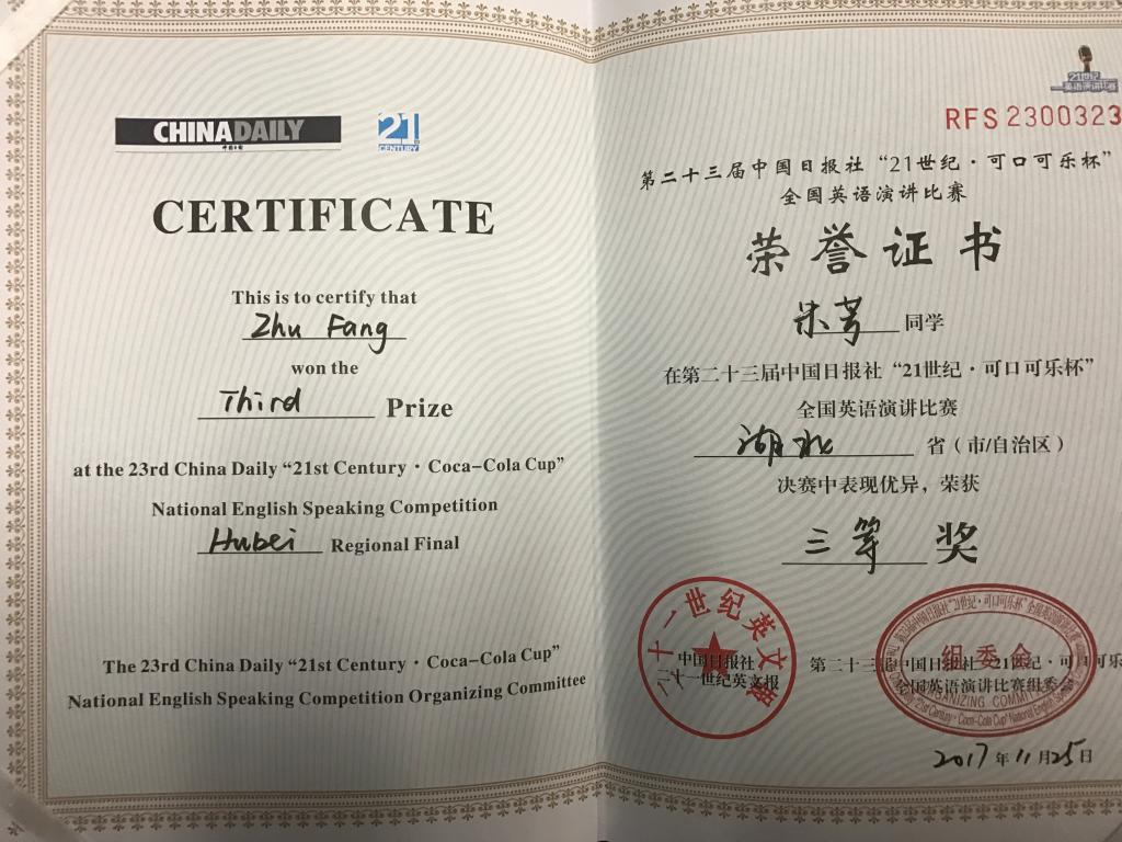 来自外国语系1704班朱芳和经济管理系工程管理1701班黄家港脱颖而出,分别代表我院英语专业组和大学英语组参加了11月底再华中科技大学举办的湖北地区决赛,两位新生沉着发挥,与全省高校选手竞争,表现不俗,双双荣获省级三等奖。