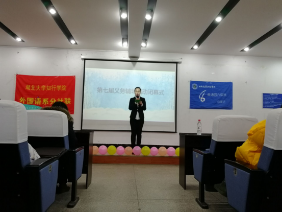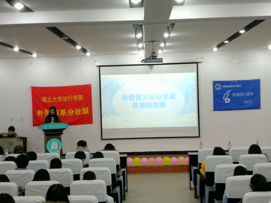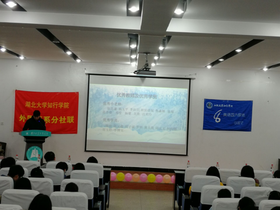 此次闭幕式活动内容主要是对四六级义务辅导活动进行总结和表彰。首先,外语系分社联主席冯庆庆上台进行讲话,对此次活动做了总结。四六级英语社团社长随后对活动中表现出色的学员和优秀志愿教师进行了表彰,获得了同学们热烈的掌声。