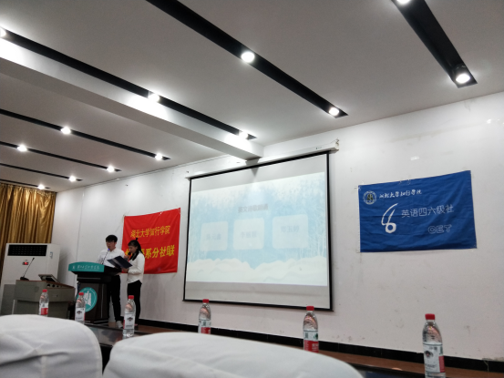 之后,四六级义务辅导活动的视频放映在屏幕上,同学们从照片中感受到了这次活动从开始到结束中学员们的勤奋刻苦和志愿小老师的殷殷教诲。视频结束,在座同学们还欣赏了英文诗歌朗诵,精彩的表演让同学们沉迷其中。