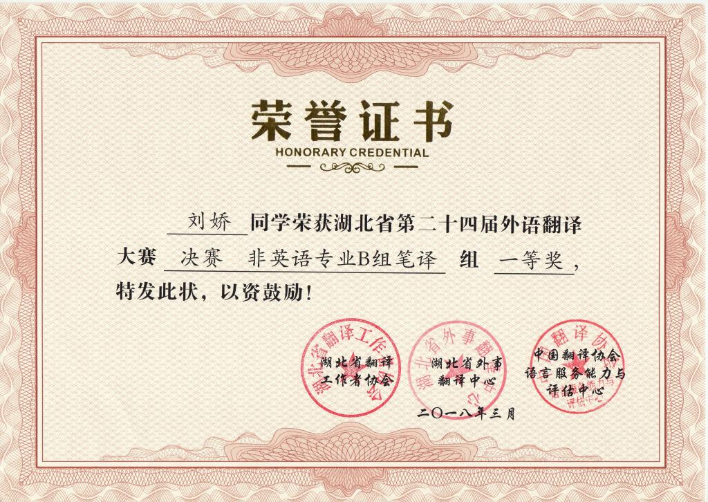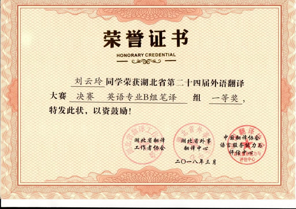 近日,第二十四届湖北省外语翻译大赛成功落幕,经过知行学子努力拼搏,共获得决赛奖项53项,大赛获奖数量和质量继续再创新高,其中:外国语系2015级翻译方向刘云玲荣获英语专业组B组笔译一等奖;2016级翻译方向欧阳雪荣获英语专业B组口译二等奖,位列该组别全省第五名;汉语文秘1401本刘娇、会计1603本王宇婕、会计1602郭玉琪三名同学荣获大学英语B组笔译一等奖。
