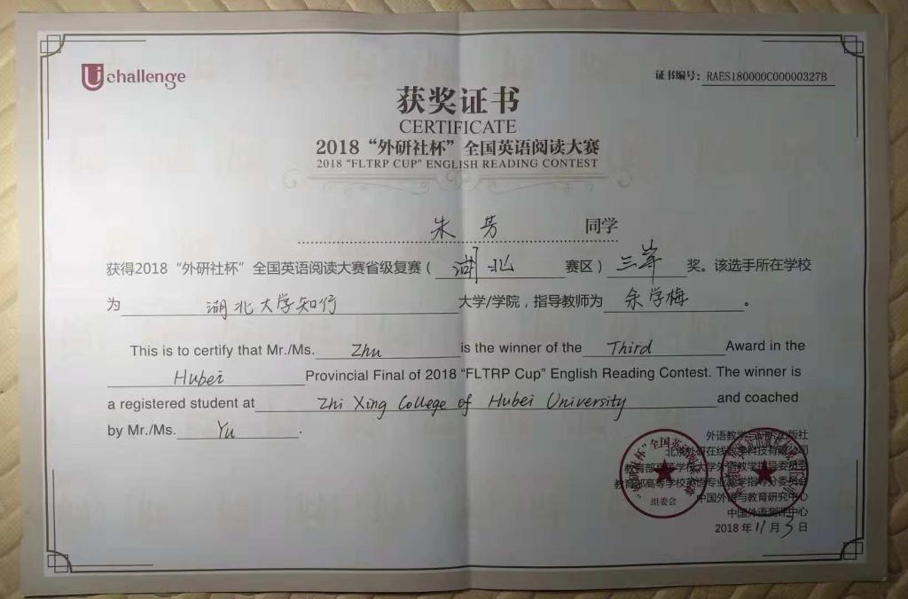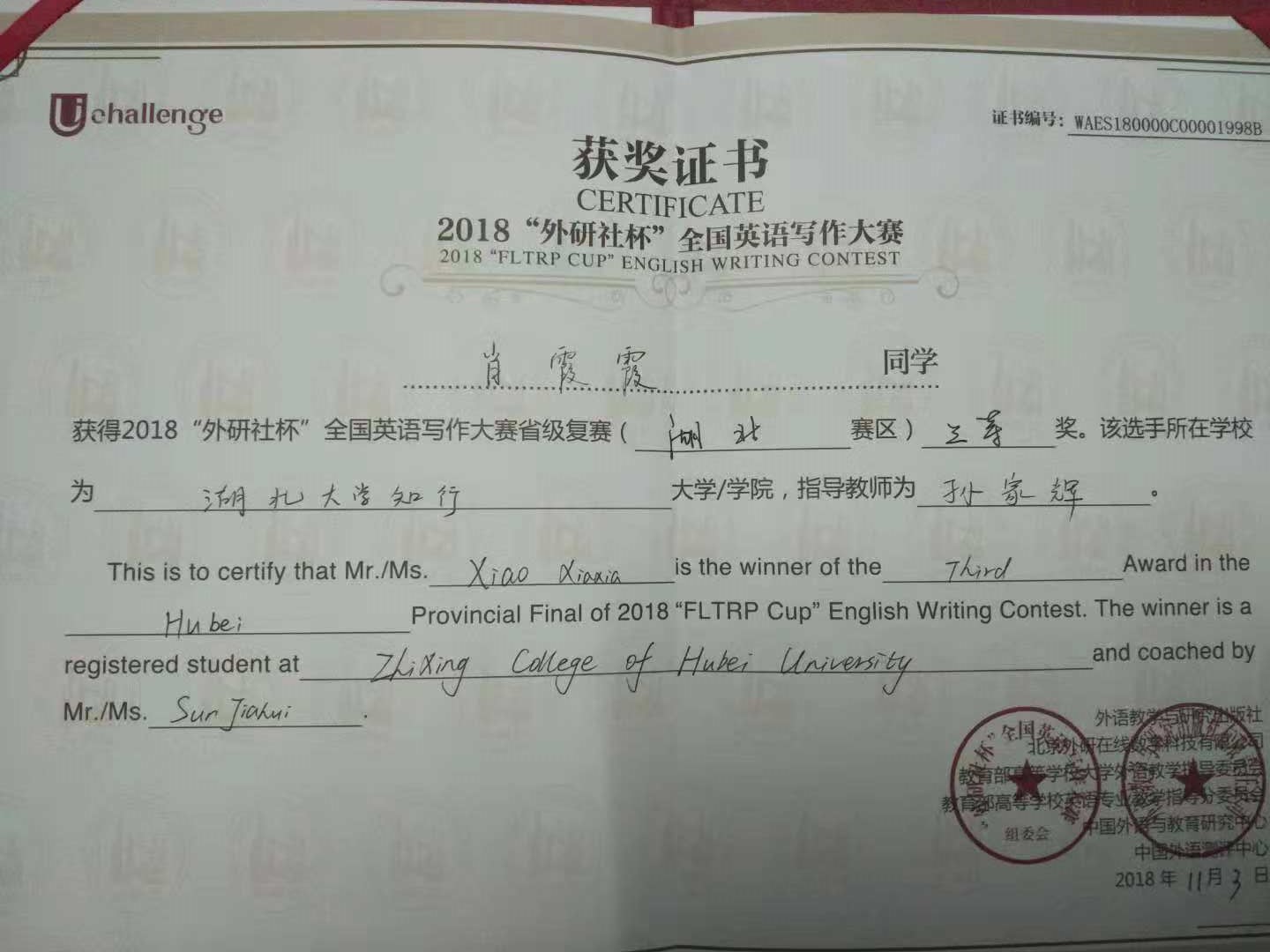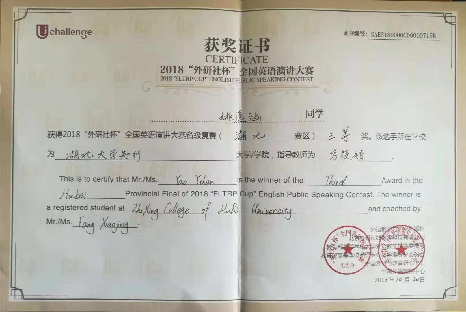 近日,2018“外研社·国才杯”全国英语演讲、写作、阅读大赛三项赛事湖北赛区复赛落下帷幕,外国语系英语专业2016级姚逸涵同学、肖霞霞同学、2017级朱芳同学分别荣获三项赛事三等奖。