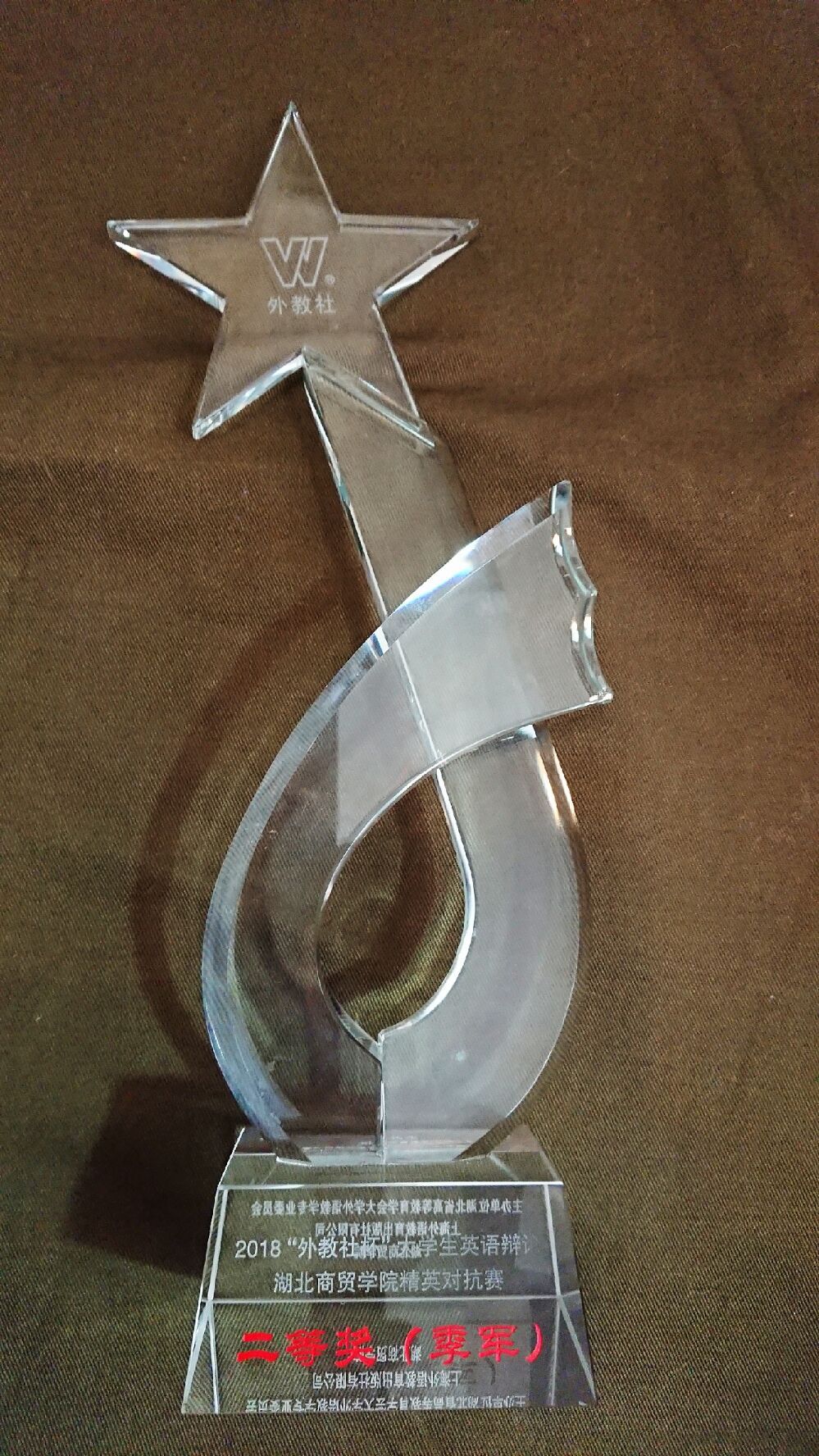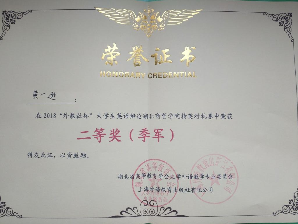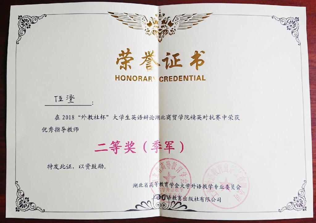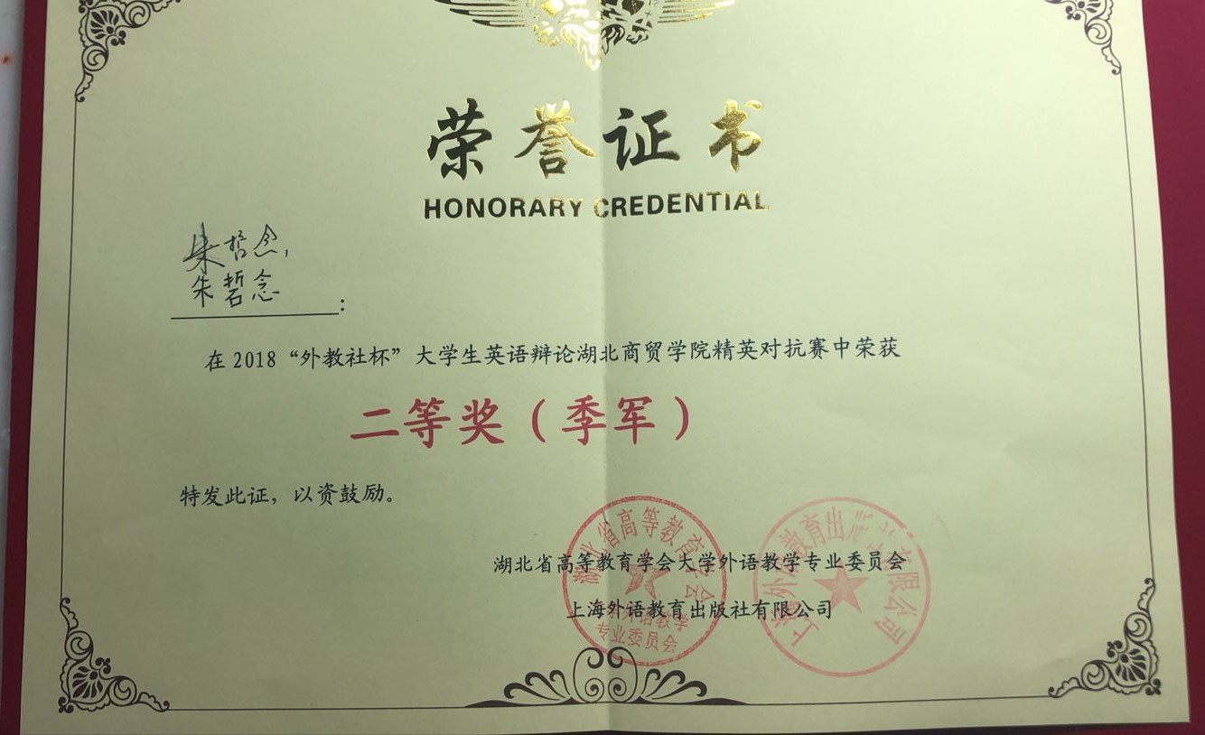 在11月10日落下帷幕的“2018年‘外教社杯’湖北省大学生英语辩论湖北商贸精英对抗赛”中,英语专业2016级朱哲念、黄一逊两名同学组成的比赛团队荣获二等奖-季军,外国语系伍澄老师获得最佳指导教师奖。