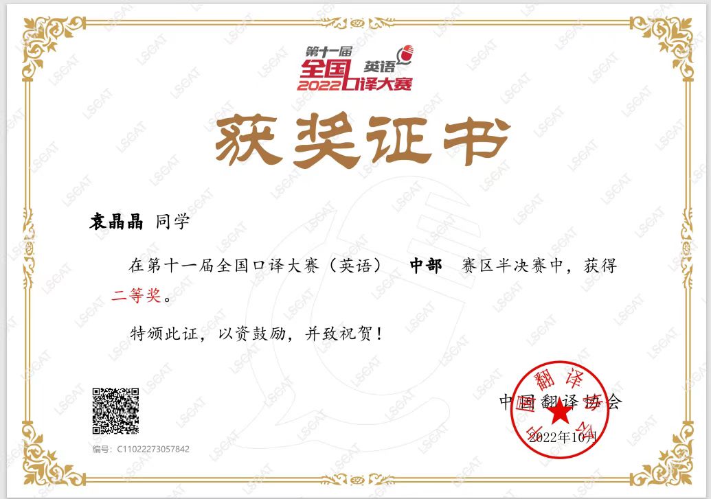 近日,由中国外文局、中国翻译协会主办的第十一届全国口译大赛半决赛落下帷幕,yl7703永利集团英语翻译1906班袁晶晶同学荣获中部赛区半决赛二等奖,这是继2017年我校冲入全国口译大赛半决赛以来获得的最佳战绩!