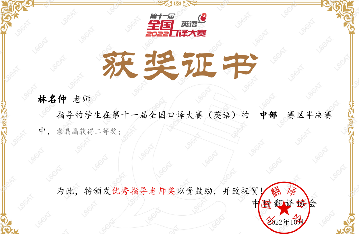 在yl7703永利集团林名仲老师指导下,袁晶晶同学在6月份湖北省复赛中以三等奖脱颖而出,成功晋级半决赛,最终在10月份中部赛区半决赛中获得二等奖!英语专业李佳惠、牛媛尉、高序伦三名同学获得省级优秀奖。
