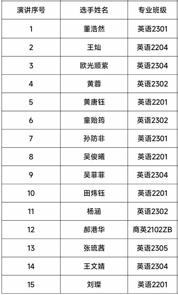 经过激烈的角逐,各位评委老师结合选手在已备演讲和即席演讲的综合表现,最终有15名优秀的选手进入决赛。名单如下: