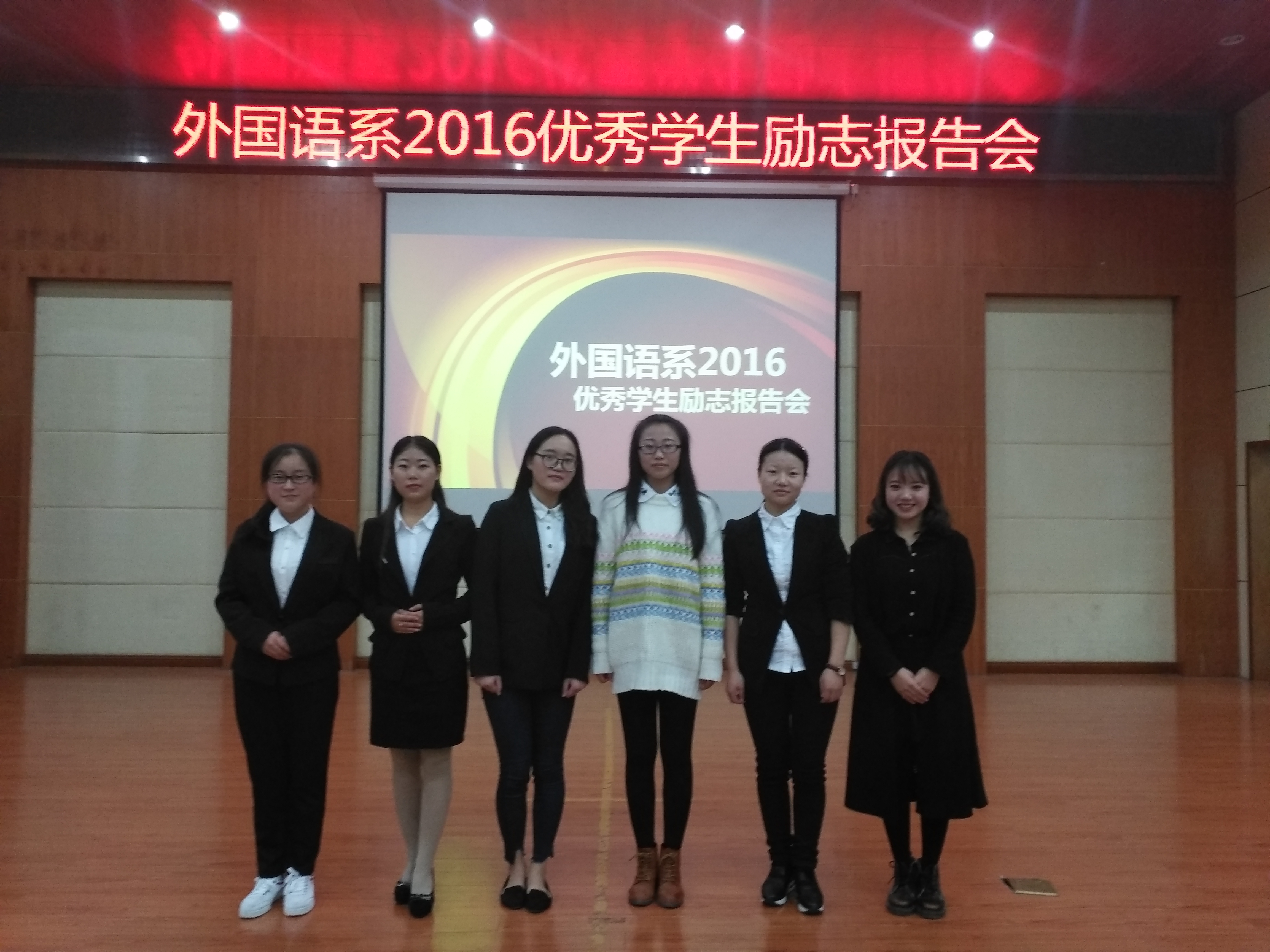 本网讯(通讯员 张乐乐)11月3日晚6:30,外国语系“优秀学生励志报告会”于报告厅201隆重举行。傅丽书记,向蕊老师,郭凡老师,冯书祥老师,陈雯老师莅临本次活动。全体大一学子参加此次报告会。