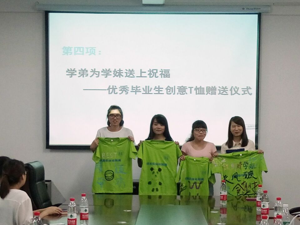 交流会前,每位毕业生在留言板给学弟学妹留下了祝福和寄语。交流会上,2016届毕业生照片集锦将大学四年来的点点滴滴一一展现,每一次活动、每一张笑脸,都是青春的回响。接着,优秀毕业生代表上台分享了他们四年的学习生活,考研过程,实习经历,并向在校的学子们提出自己的建议,珍惜在校的一分一秒。创意T恤赠送仪式也在今晚举行。由大一大二的志愿者亲手为优秀毕业生涂鸦的文化衫送入了他们手中,每一笔都汇聚着浓浓的祝福。