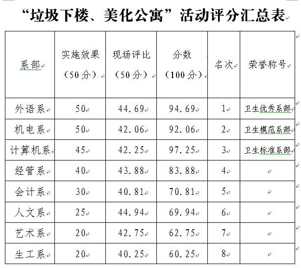 通过“垃圾下楼 美化公寓”活动,不仅美化了宿舍环境,还有效的避免了二次污染、疾病传播,引导同学们逐渐养成了良好的文明卫生习惯,切实做到了自觉维护环境卫生。活动开展至今,我系在学院通报次数呈递减趋势,目前已基本实现了零通报。
