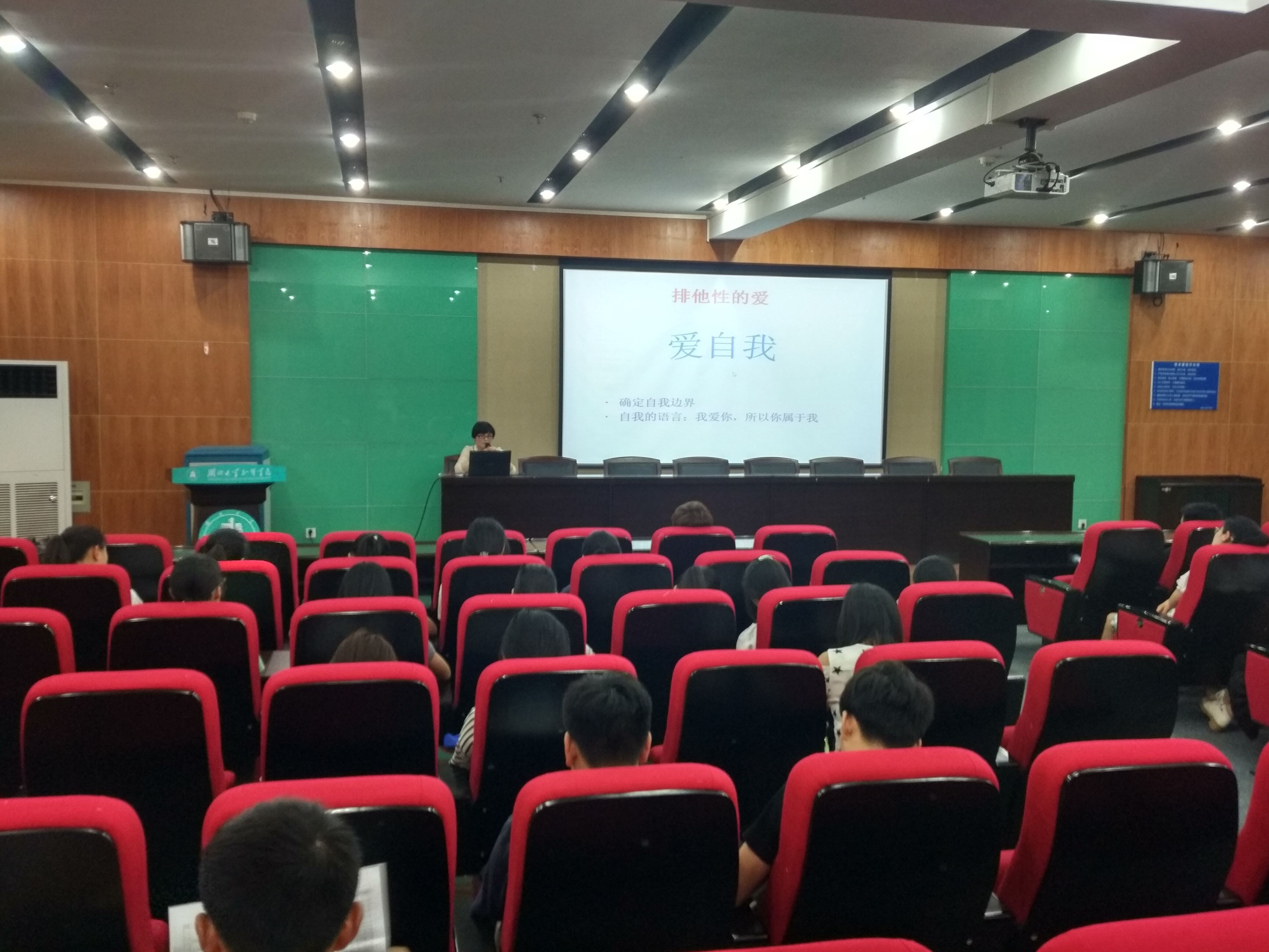 官翠娥老师首先从大学生爱情面面观谈起,接着从什么是爱情,大学生恋爱与调试,培养健康的恋爱心理和行为和如何处理恋爱中的问题四个主题为我们讲解。一个故事一个道理,宫翠娥老师生动有趣的将恋爱中的方方面面娓娓道来。最后,官翠娥老师还向学生们推荐了《男人来自火星,女人来自金星》这本书,并为同学们做了几个有趣的心理测试,帮助学生们更好的认识恋爱,认识自己。在此次讲座中,官翠娥老师还不断的告诉学生们要做到自尊自爱,正确恋爱。