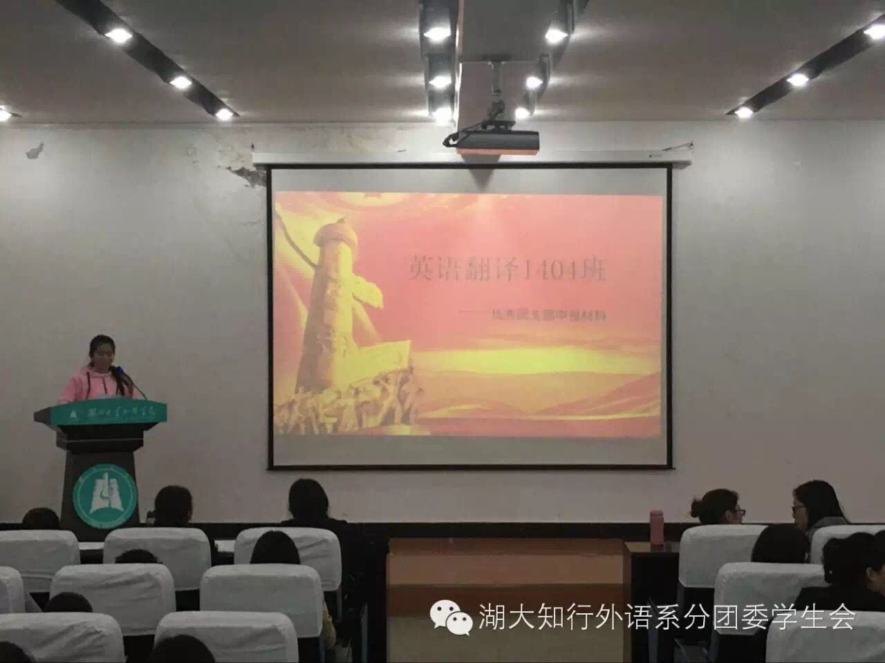 外语系18个班级团支部分别从团支部基本组织建设,团日活动,团支部获得荣誉,寝室文化建设,学风建设等向大家汇报在2015学年中的情况。各个班级突出自己独有的特色,具体汇报了班级在2015年所经历的种种。每一次团日活动,每一张集体合影,每一张班级荣誉证书尽展班级风采。这一年来多姿多彩的班级生活通过精心制作的PPT更是一览无余。在每个班级汇报完后,评委老师都会针对其内容提出相应的问题进行答辩。最后,学生书记雷娟对外国语系申报红旗分团委材料进行汇报。
