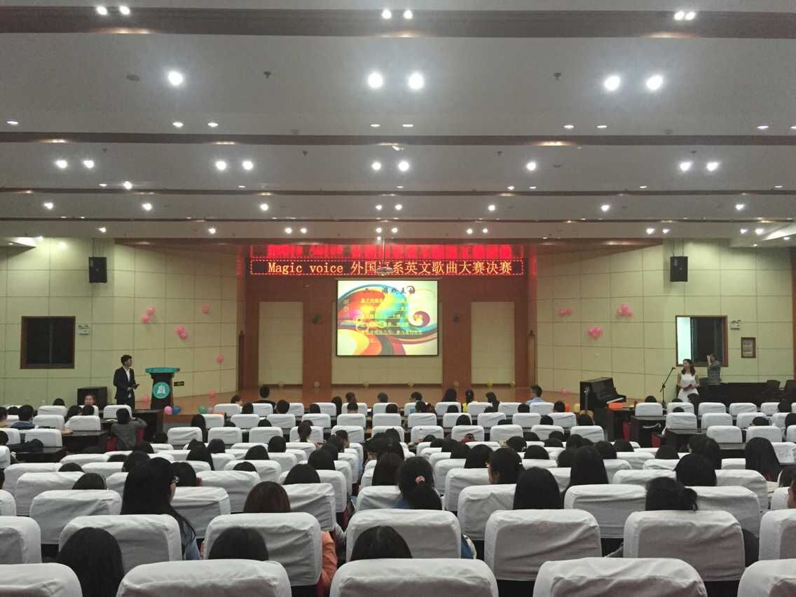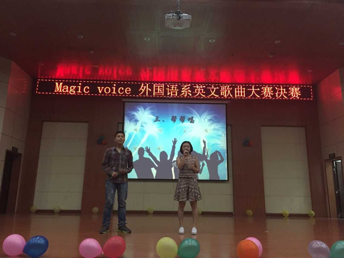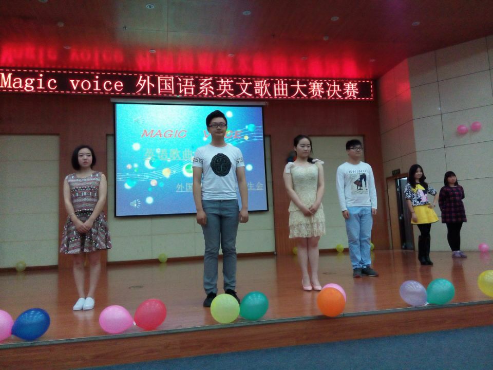 本网讯(通讯员冯书祥 董雪芹)为丰富校园文化,活跃校园气氛,2015年5月11号晚6:30,由外国语系主办“Magic voice 英语歌曲大赛”的决赛于行政楼201举行。此次比赛面向全院,经过层层筛选最终有来自各系的九位选手进入决赛。