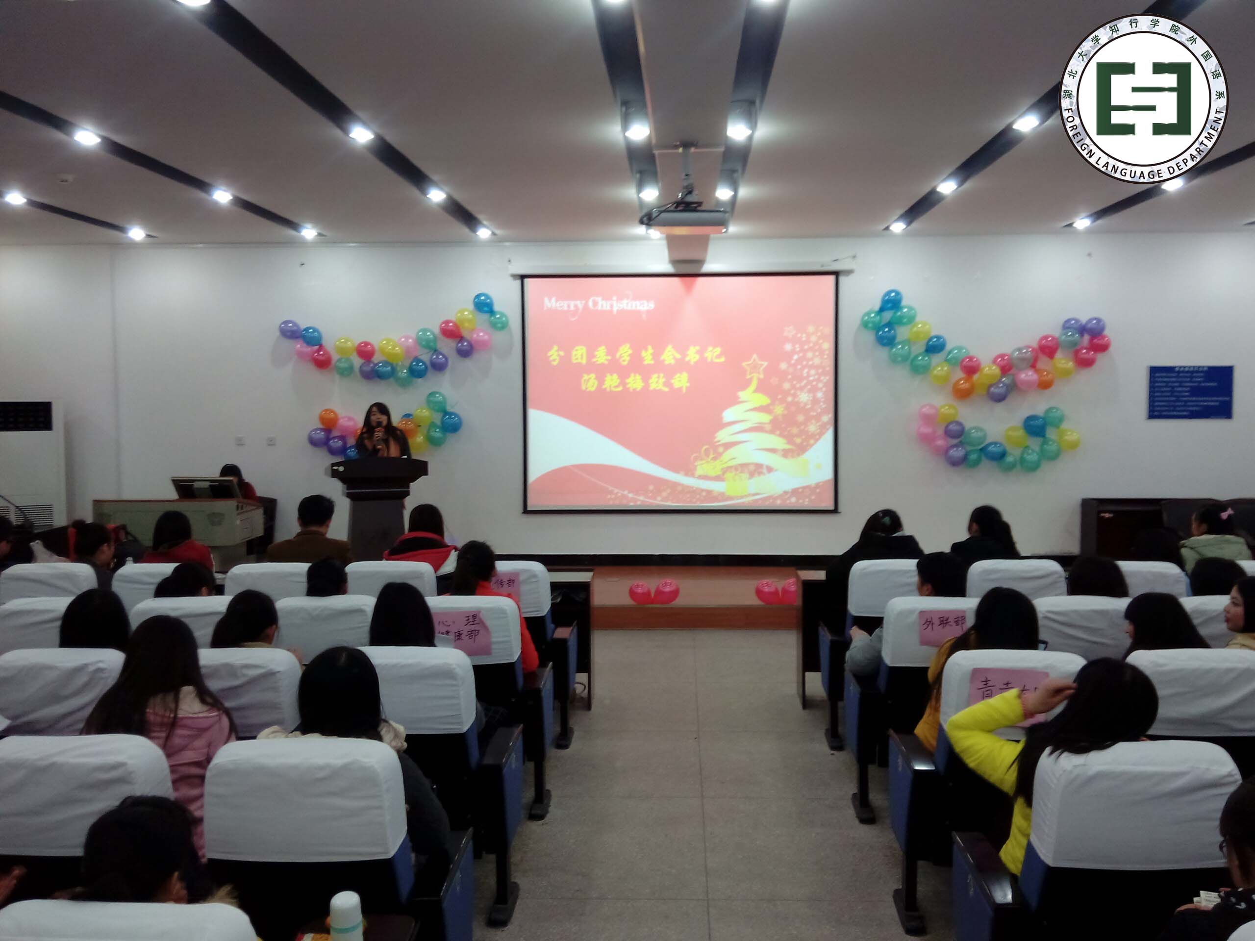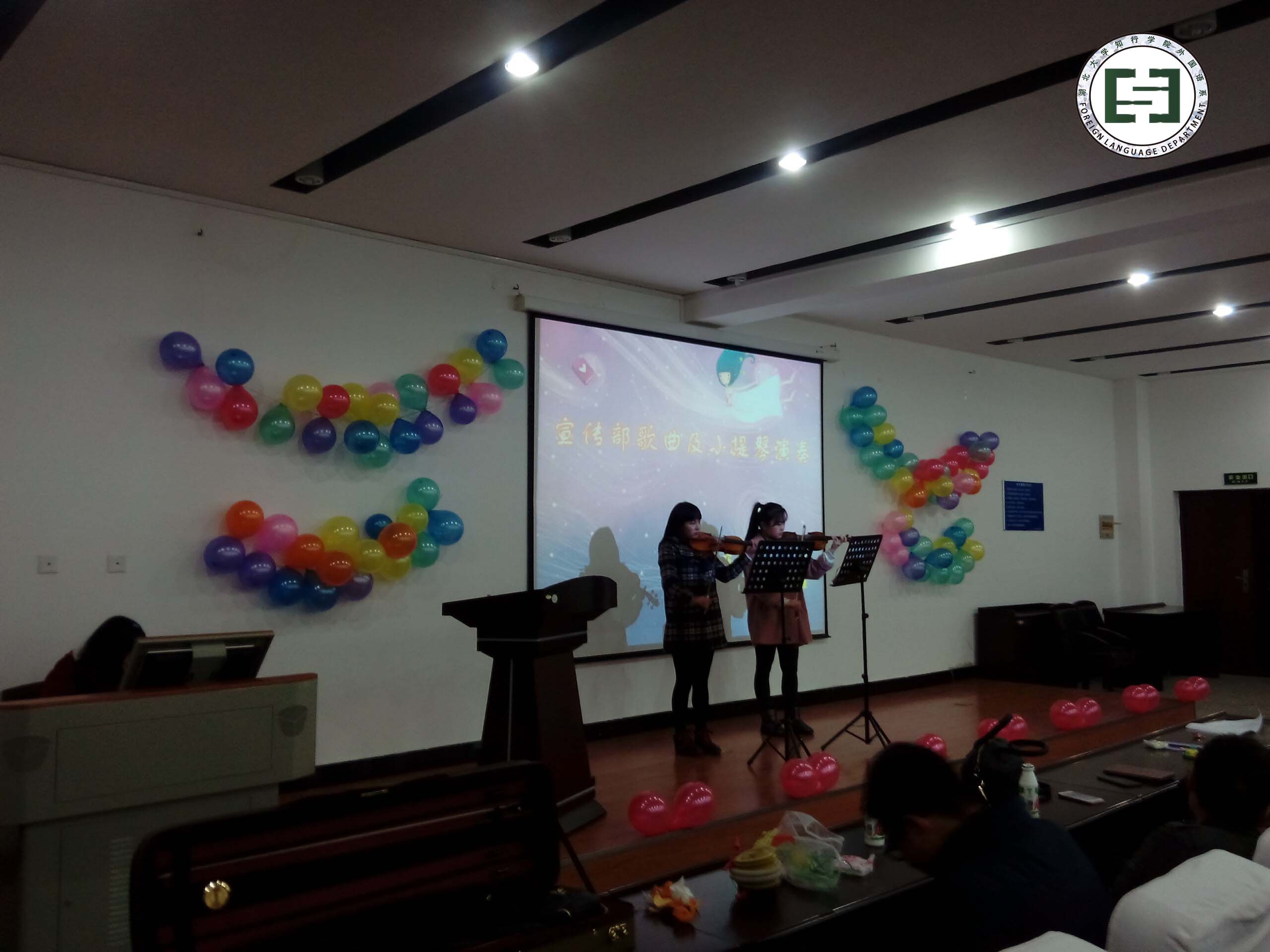 会前,分团委学生会精心给大家准备了小点心和水果,给会场增添了一丝轻松感。主持人宣布晚会开始后,外国语系分团委学生会书记汤艳梅进行了会前致辞,对这一学期所有部门的工作进行了总结,对大家的工作提出了表扬以及寄望,最后也给予了大家圣诞祝福。晚会中,各个部门进行了才艺展示,体育部的歌曲,青志大队的舞蹈串烧,宣传部的小提琴演奏及歌曲演唱,自律部的话剧,学习部的音乐剧……无一不拉动了现场的气氛,让舞台延伸到了观众席。其中,穿插的互动小游戏也拉近了各成员之间的距离,更有学生会主席程星和分团委副书记张萌倾情加盟拼智慧,秀才艺,现场气氛达到了高潮。