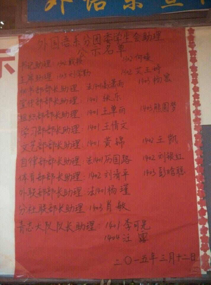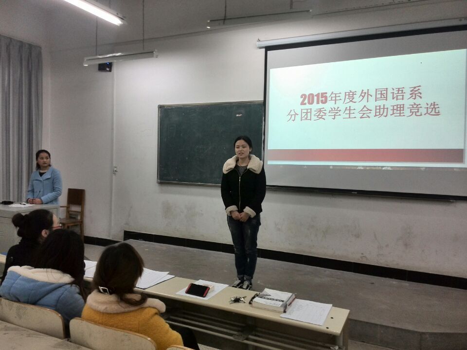 本网讯(通讯员 刘梦)2015年3月11日在4-105室举行外国语系分团委学生会助理竞选仪式。