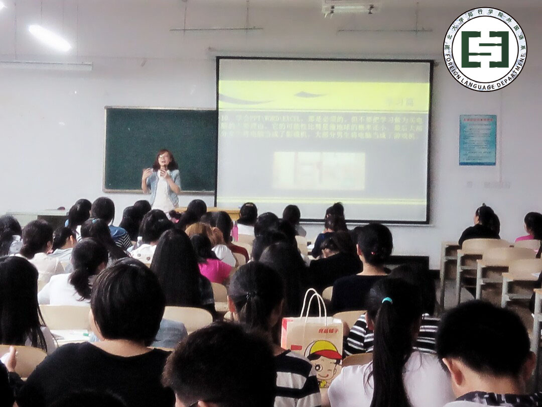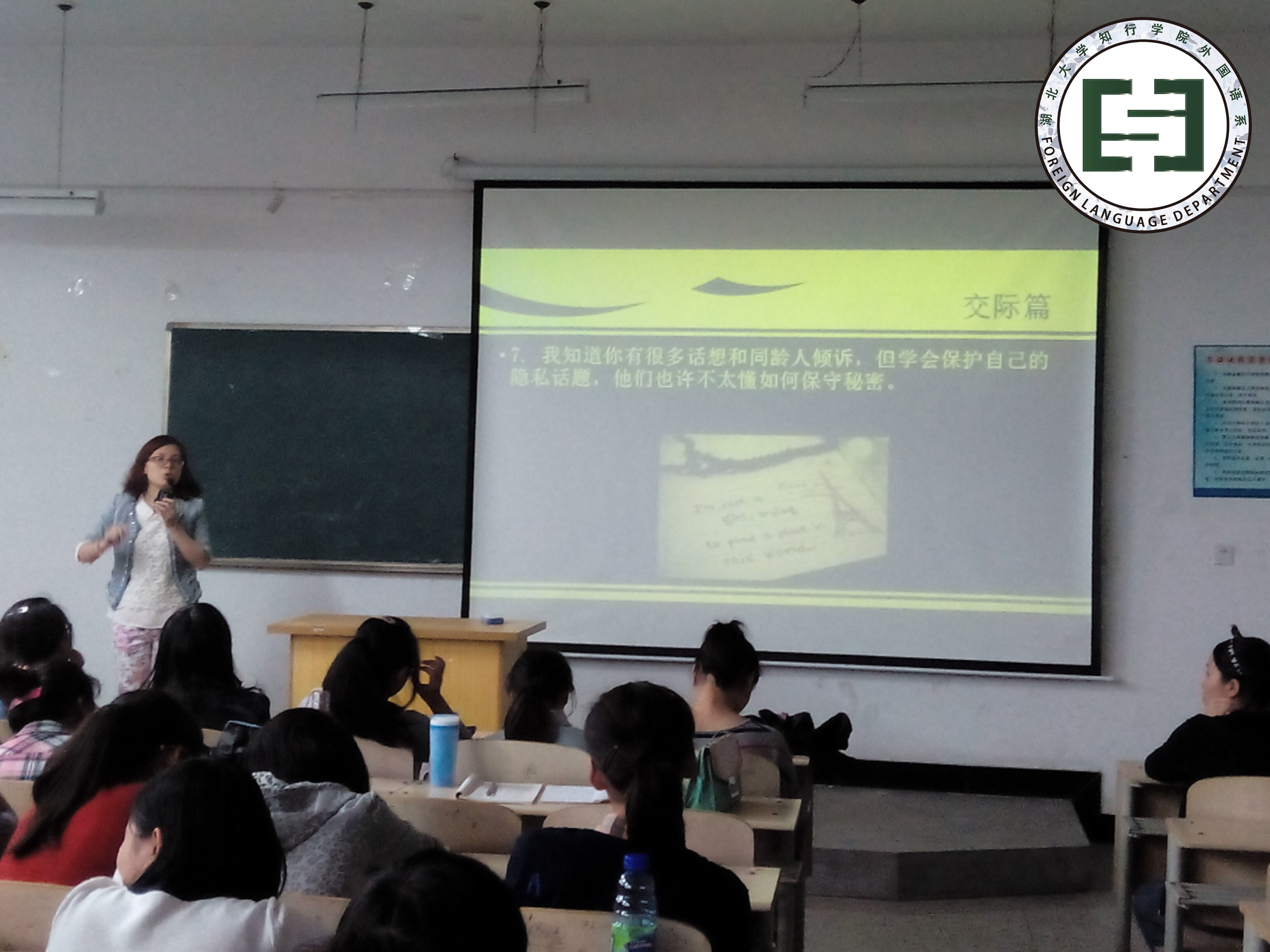 本网讯(通讯员汤飘)10月20号晚6点30分,外国语系2014届新生适应性讲座正式开始,讲座由外国语系心理辅导老师向蕊老师主讲。